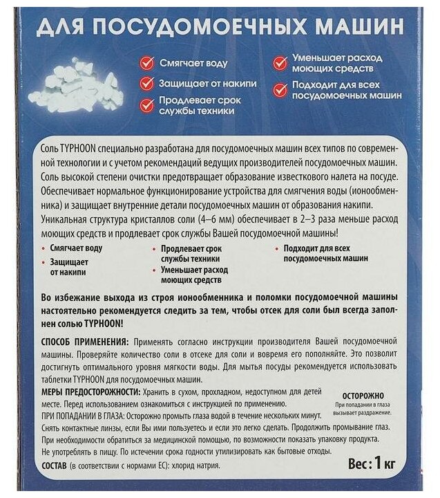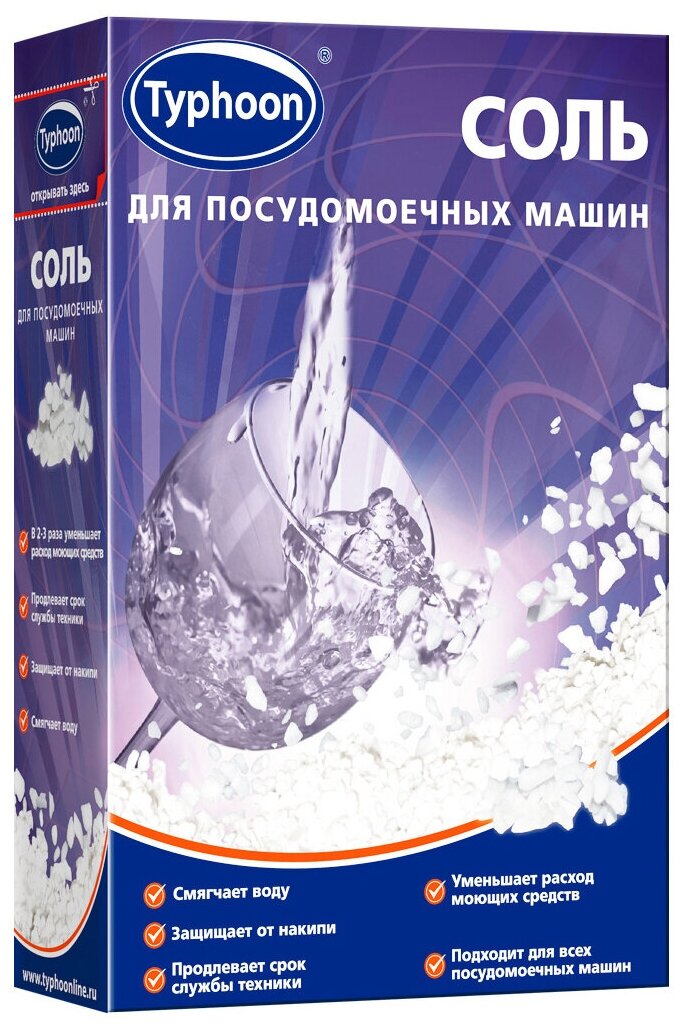 Соль высокой степени очистки предотвращает образование известкового налета на посуде. Обеспечивает нормальное функционирование устройства для смягчения воды (ионообменника) и защищает внутренние детали посудомоечных машин от образования накипи.