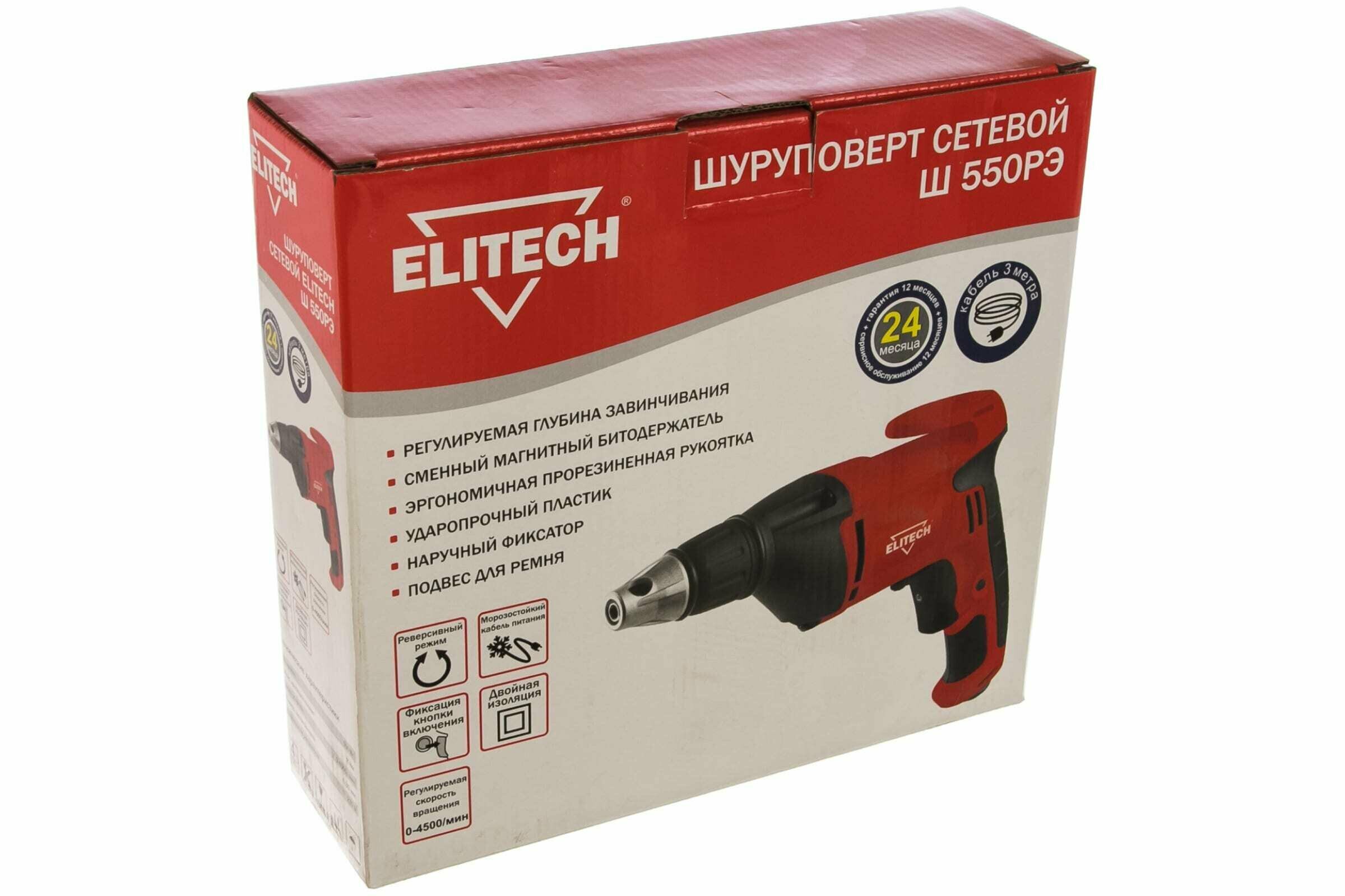 - Сетевой шуруповерт Elitech Ш 550РЭ 550 Вт , 8Hm , 1 скорость , число об/мин 0-4500 , кабель 3 м
