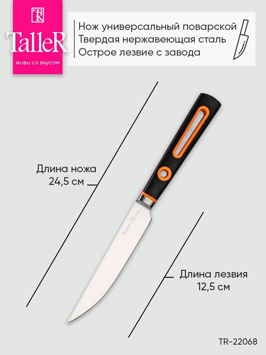Нож универсальный «Ведж» TR-22068, длина лезвия 12,5 см. Подходит для очистки, нарезки различных продуктов. Толщина лезвия - 2 мм. Лезвие ножа сделано из твердой коррозионностойкой стали AISI 420S45 (3Cr13). Рукояти выполнены из прочного ABS-пластика. В рукояти имеется отверстие, позволяющее подвешивать нож. Используйте для заточки точильные камни, мусаты, ножеточки. Рекомендуется ручная мойка.