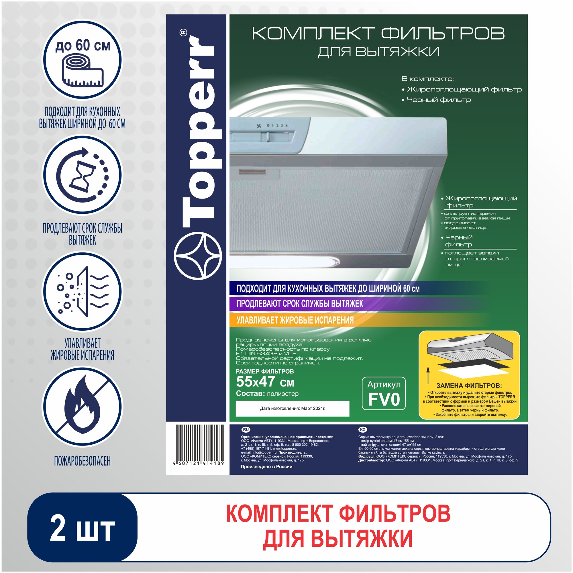 В наборе Topperr входит 2 предмета: угольный и жиропоглощающий фильтр. Подходит к любым кухонным вытяжкам шириной 50-60 см, удаляет запахи и улавливает все жировые испарения. Пожаробезопасен.