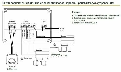Блок управления Neptun (Нептун) предназначен для бытовой эксплуатации и отличается простой накладной установкой. Устройство позволяет вовремя обнаружить протечку, среагировать и подавать звуковой или световой сигнал о произошедшей аварии. Благодаря этому оборудование перекрывает воду, чтобы избежать плачевных последствий протечки.