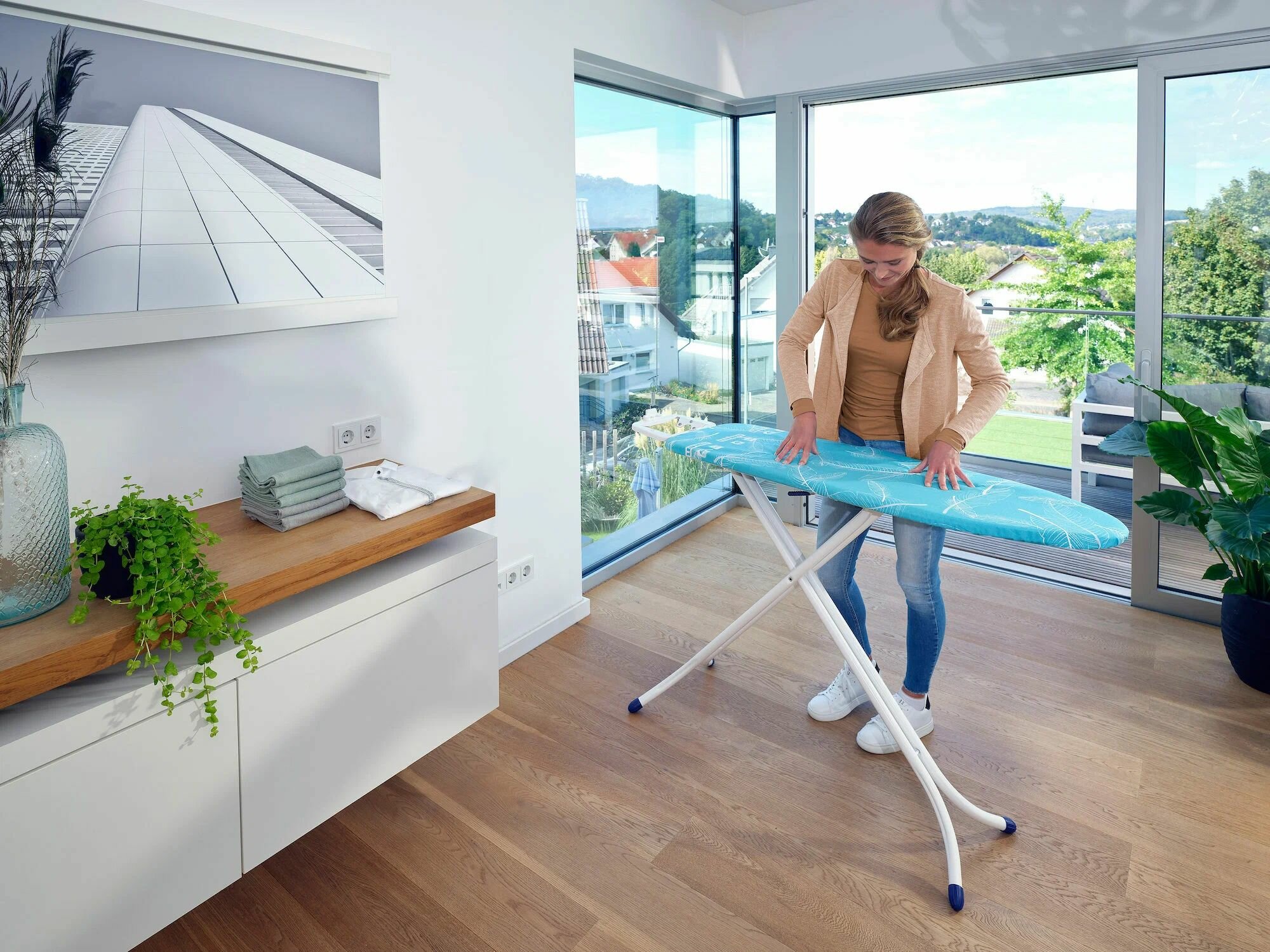 Опирается рабочая поверхность на высокопрочную раму, которая обладает превосходной устойчивостью даже на недостаточно ровных полах. Пользователь имеет возможность легко и быстро изменить высоту положения доски до 88 см (высота до нижней кромки гладильной поверхности).