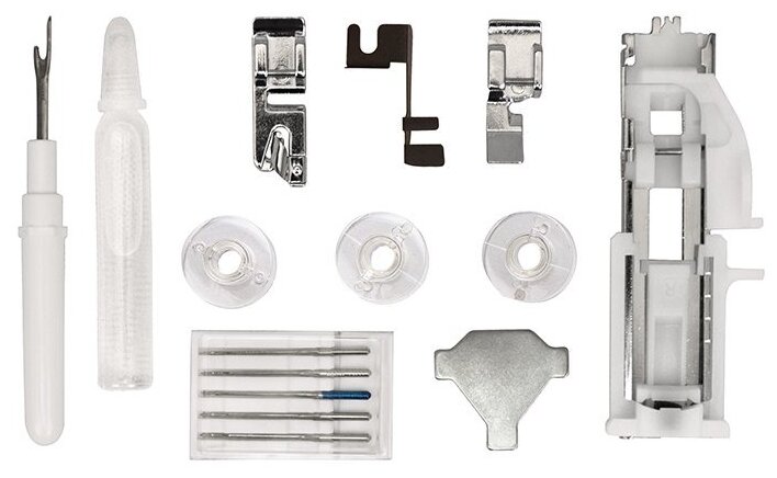 | Комплект поставки | Лапка для вшивания молний; Лапка универсальная; Лапка для подрубки; Лапка для обметывания петель; Комплект игл; Нож-вспарыватель; Шпульки; Направитель швов; Масленка; Отвертка; Педаль; Жесткий чехол; Инструкция |