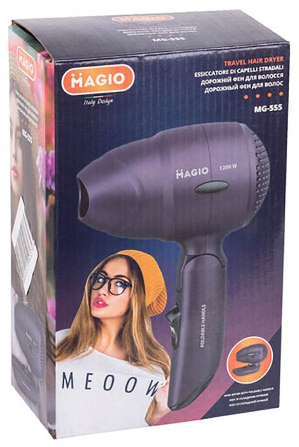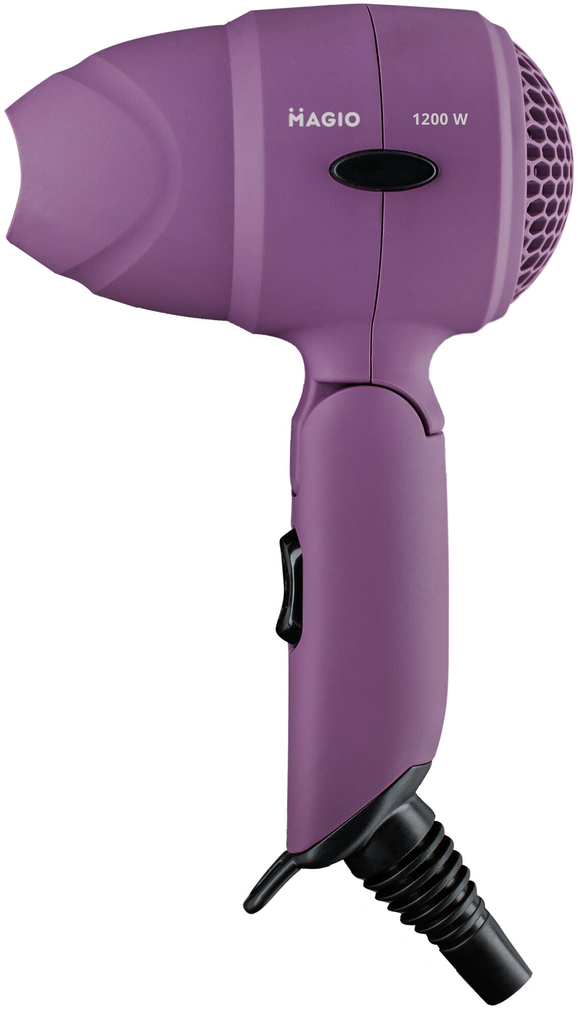 Фен Magio МG-555 – это великолепно продуманный фен для того, чтобы взять его с собой в путешествие. Если вы постоянно вынуждены проводить время в командировках, то равных этой технике вы не найдете: компактный, малого веса, с достаточной мощностью (1200 Вт). Не отказывайте себе в возможности создать отменную укладку в любых условиях!Стильный дизайн. Сильная сторона фена, конечно же, в его функциональных возможностях. Но и внешняя часть не проиграла: компактный бочкообразный корпус сделан в ярком фиолетовом цвете, имеет немаркую матовую фактуру. А цепкая структура поверхности еще и обеспечивает великолепное сцепление с кожей ладони, не давая фену выпасть из рук.Регулировки фена. Устройство ориентировано на простую эксплуатацию, поэтому снабжено простым элементом управления – кнопкой. Она располагается на корпусе как раз в районе досягаемости пальцев держащей руки. Вы можете регулировать интенсивность воздушного потока и его температуру, выбирая из двух предлагаемых уровней для каждого из этих параметров. Даже простая по функционалу модель способна обеспечить разное воздействие на волосы, что позволяет подобрать наиболее оптимальное именно для вашего типа.Складная ручка. Конструкция дорожного фена отличается от обыкновенного наличием трансформируемой рукояти. Благодаря складной ручке вы сможете уменьшить габариты техники, что будет полезно при сборе дорожного чемодана.Петля подвешивания. Укрепленное основание шнура оснащено функциональной деталью хранения – петлей для подвешивания. Она упрощает хранение, позволяя переместить технику в вертикальное пространство – на специальный стенд или стену. Концентратор в комплекте. Фен комплектуется насадкой-концентратором, которая удлиняет его основную часть и направляет поток воздуха более узко и интенсивнее.