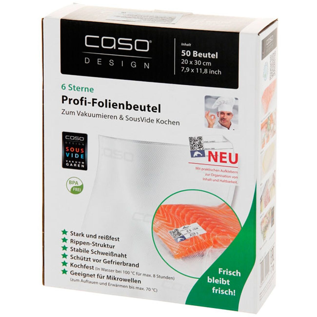 | Особенности и характеристики | 50 профессиональных пакетов CASO VC размером 20 x 30 см для вакуумной упаковки с ребристой внутренней поверхностью для оптимального вакуумирования. Высокая прочность пакета допускает замораживание, использование в СВЧ печи, готовку по технологии Sous-Vide. |