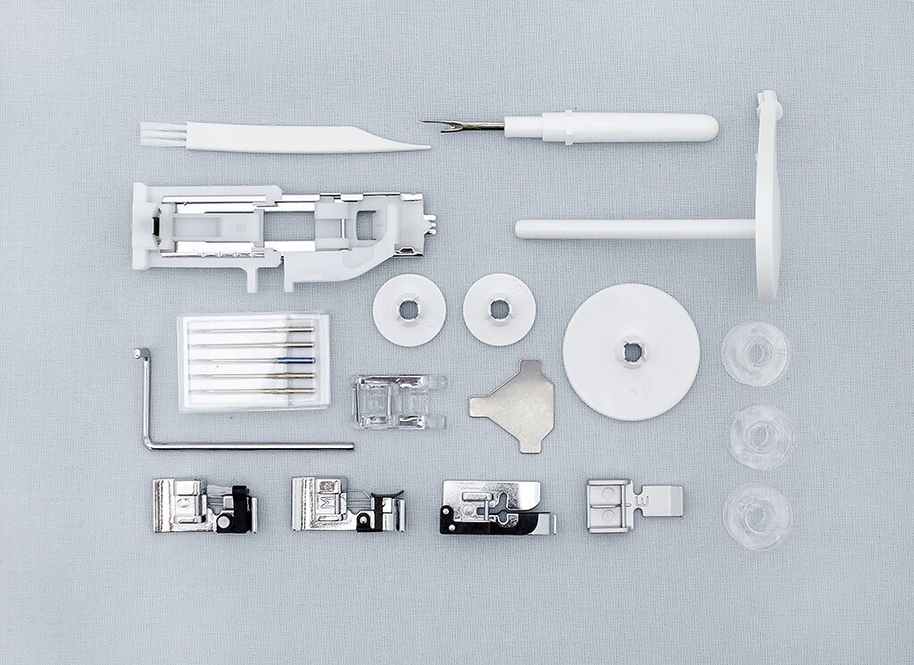 | Комплект поставки | лапка универсальная; лапка для вшивания молнии; лапка для потайного шва; лапка оверлочная; лапка для подрубки; шпульки; набор игл; вспарыватель; отвертка-ключ; щеточка для чистки; ограничитель катушки малый и большой |