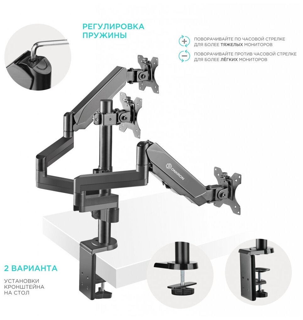 Настольный кронштейн для трёх мониторов, выполненный по технологии газлифт, ONKRON подходит для мониторов и телевизоров диагональю от 13 до 32 дюймов и весом до 8 кг на каждый.