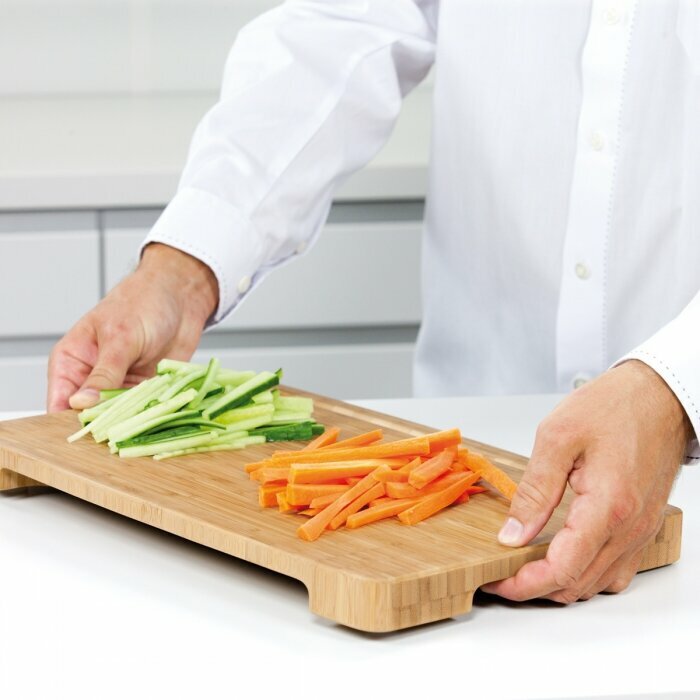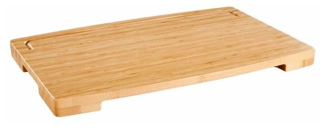 Массивная разделочная доcка из нескольких слоев специального натурального бамбука прекрасно подходит для нарезания, разделывания и отбивания продуктов. Выемка на нижней части доски позволяет вставить тарелку или поднос, чтобы легко переложить на них нарезанные продукты, разделочная доска наклонена к желобу для стекания жидкости. Удобные ручки для безопасного обращения, противоскользящая обработка. Мойте под проточной водой, не мойте в посудомоечной машине. Гарантия 5 лет.