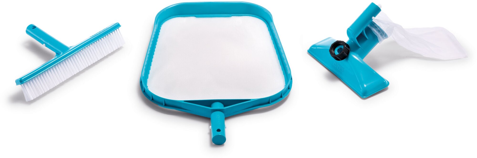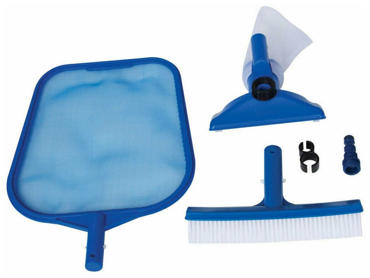 Комплект сменных насадок для чистки бассейна. В набор Intex входит: сачок для сбора мусора с поверхности воды, щетка для очистки стенок бассейна, вакуумная насадка - пылесос с мешком для мусора. Набор сочетается с телескопической алюминиевой ручкой арт. 29054 (приобретается отдельно).