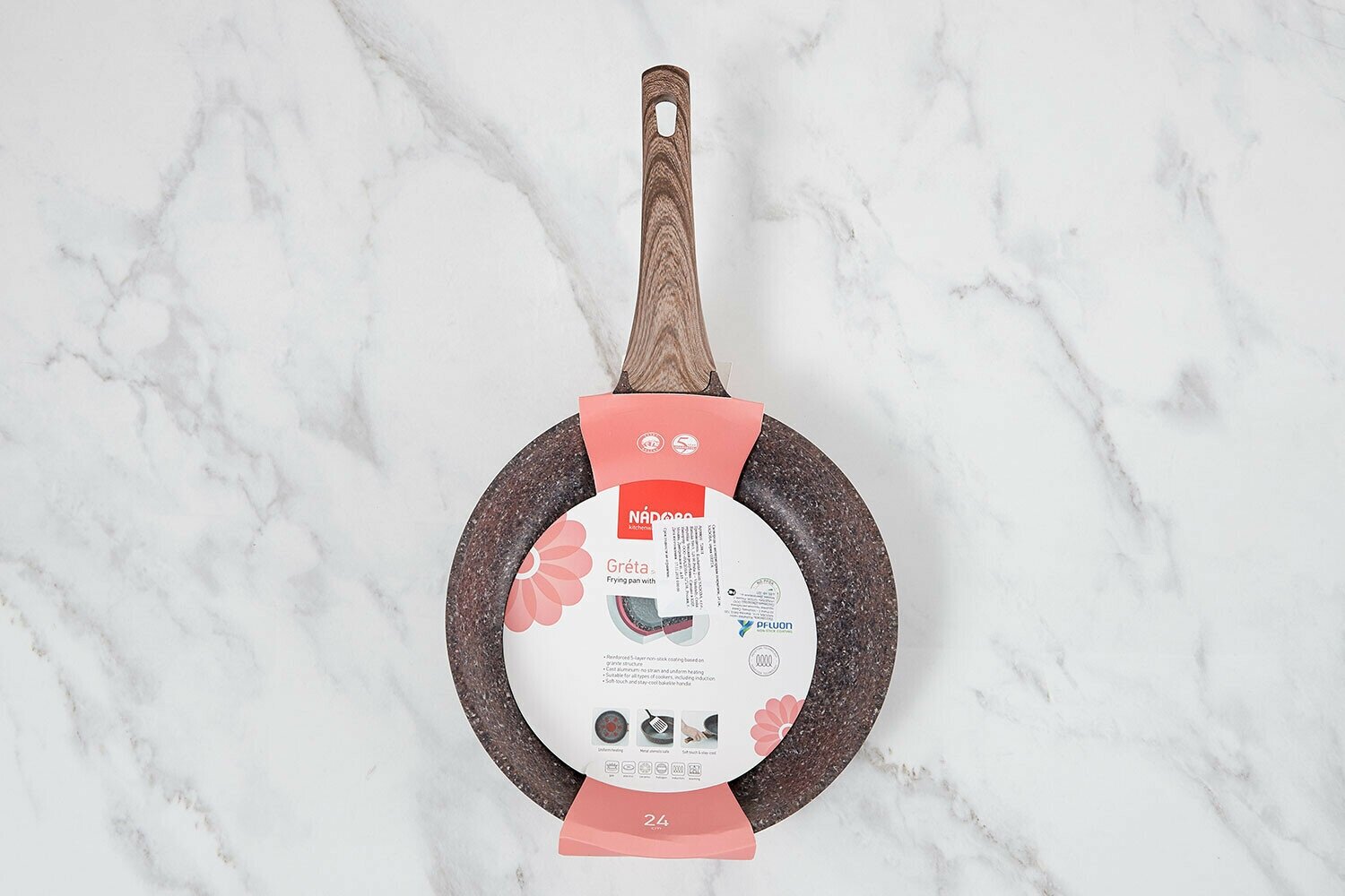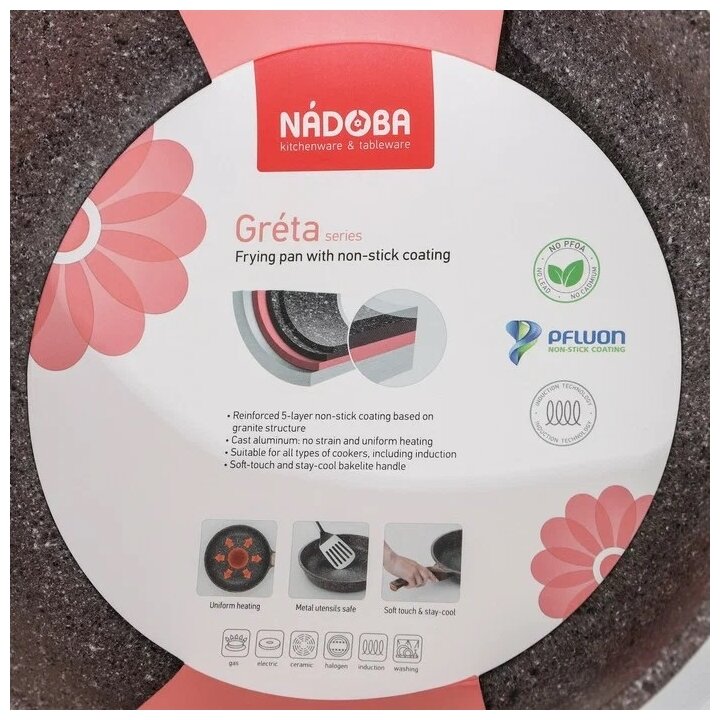 Продукция серии Gréta изготовлена из литого алюминия с использованием особо прочного 5-слойного антипригарного покрытия Pfluon на основе структуры гранита с прекрасными антипригарными свойствами, прочностью и износостойкостью, благодаря чему посуда подходит для ежедневного использования и будет служить не один год.