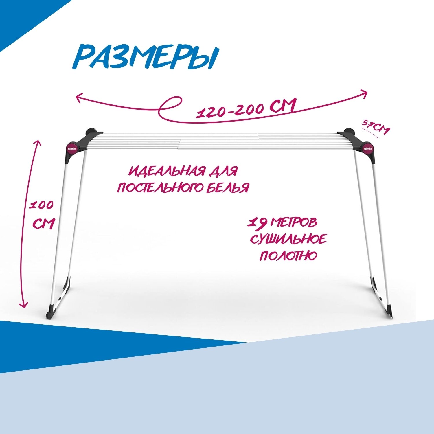Рабочая поверхность от 20 до 28 м. Раздвигается (от 110 до 190 см) с помощью телескопических направляющих. Позволяет свободно развесить как большие простыни, так и белье небольшого размера. Советы: