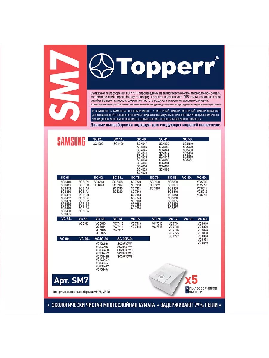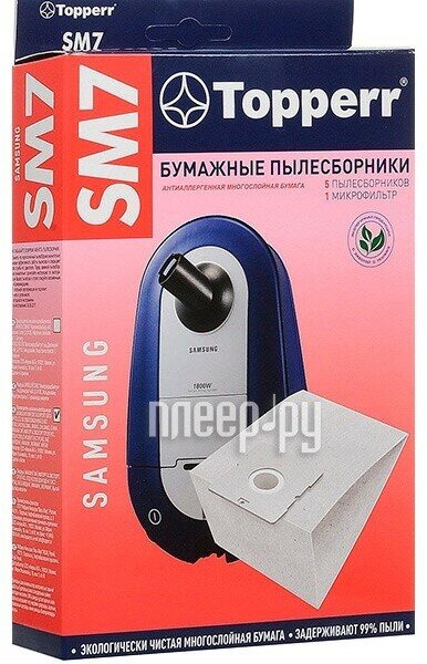Бумажные пылесборники SM 7 для пылесосов SAMSUNG изготовлены из экологически чистой двухслойной бумаги, соответствующей европейскому стандарту качества, задерживают 99% пыли, продлевая срок службы пылесоса, сохраняют чистоту воздуха и устраняют вредные бактерии.