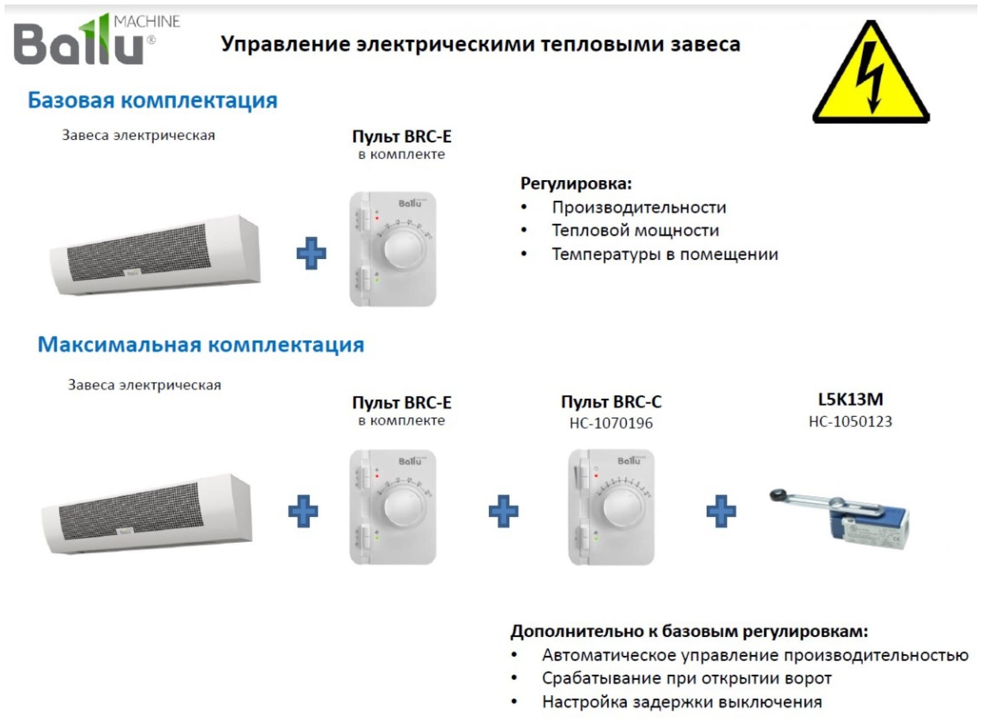 Пульт Ballu (Баллу) представляет собой новую разработку современного пульта управления электронного типа, предназначенного для электрических воздушных завес того же производителя. Пульт производится в Европе по европейским стандартам, на заводе. В задачу пульта входит установка требуемой температуры на завесе, которую следует удерживать постоянно. После выхода на требуемый уровень, за счет автоматики происходит экономия затрат электроэнергии, снижается шум, и уменьшается интенсивность воздушного потока. При работе завес отслеживается открытие, закрытие дверей для последующего включения или выключения.