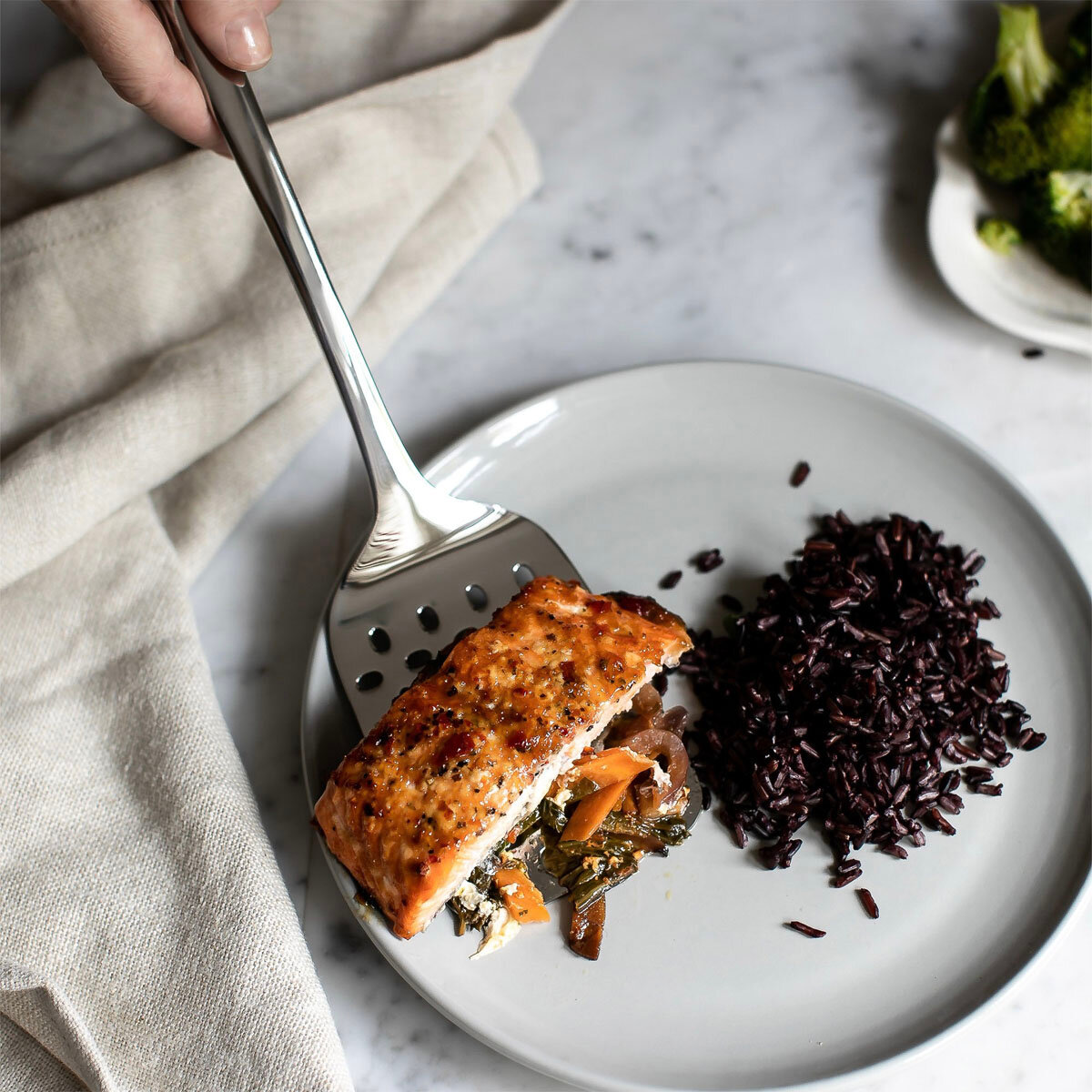Товары коллекции Signature оснащены удобными круглыми ручками с выступом на конце. Каждый предмет изготовлен из высококачественной нержавеющей стали 18/10, был разработан с учетом своего назначения и для максимального удобства использования. Лопатка идеально подходит в качестве подвесного кухонного инструмента, а также для сервировки за столом.