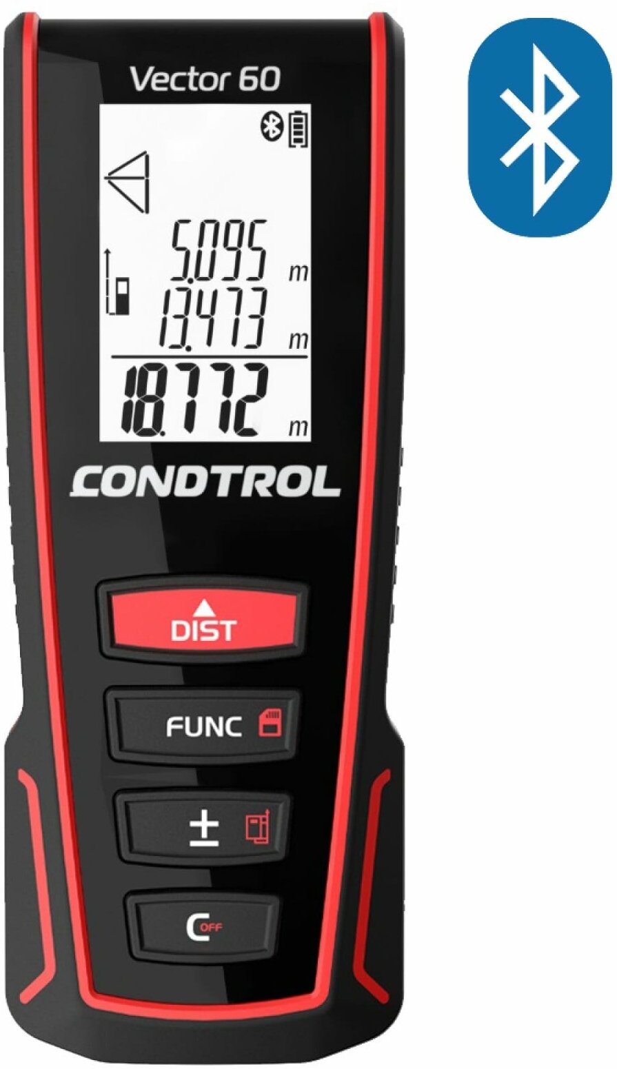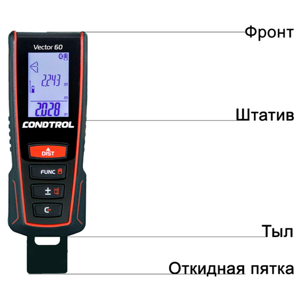 | Прочие особенности | Оптимальный набор функций. Дальномер CONDTROL Vector 60 выполняет автоматические вычисления площади, объёма, сложение и вычитание. Для проведения замеров в труднодоступных местах дальномер имеет функцию косвенных вычислений по теореме Пифагора. У лазерной рулетки CONDTROL Vector 60 также есть функция трекинга.,Встроенный Bluetooth. CONDTROL Vector 60 может передавать результаты измерений в смартфон или планшет. Достаточно скачать c Google Play или App Store бесплатное приложение CONDTROL Smart Measure. С помощью этой программы у пользователя появляется масса возможностей:,– можно хранить в памяти смартфона неограниченное число измерений;,– фотографировать объекты, помещения, декор, мебель и наносить размеры на них, делать ремарки, комментарии, что по достоинству оценят архитекторы, дизайнеры, декораторы;,– рисовать планы помещений с размерной сеткой;,– сохранять и экспортировать полученные файлы, что значительно упрощает работу строителей, дизайнеров, изготовителей мебели и т.д.,Защищённый корпус. Эргономичная форма лазерной рулетки CONDTROL Vector 60 и рельефная поверхность обеспечивают надёжный обхват прибора. Герметичность корпуса по стандарту IP54 позволяет пользоваться CONDTROL Vector 60 в условиях стройплощадки. Дальномер имеет четыре кнопки управления, которые удобно нажимать даже в перчатках.,Откидная пятка и крепление на штатив. Расстояние может измеряться с передней или задней стенки корпуса, со штатива, откидной скобы. Откидная скоба даёт возможность проводить точные замеры из углов и труднодоступных мест.,Li-ion аккумулятор. Современные технологии стремительно интегрируются в измерительную технику. Теперь у дальномеров нет батарейного отсека, благодаря чему повышается жесткость корпуса и степень пылевлагозащиты. Ресурс аккумулятора удивляет своей производительностью. Одного часа зарядки достаточно, чтобы сделать несколько сотен измерений.,Лазерная рулетка CONDTROL Vector 60 пригодится строителям, отделочникам, монтажникам, замерщикам окон, установщикам мебели, домашним мастерам. С помощью дальномера вы легко сможете рассчитать необходимое количество отделочных материалов для ремонта, измерить площадь квартиры или дома при покупке жилья и т.д. |