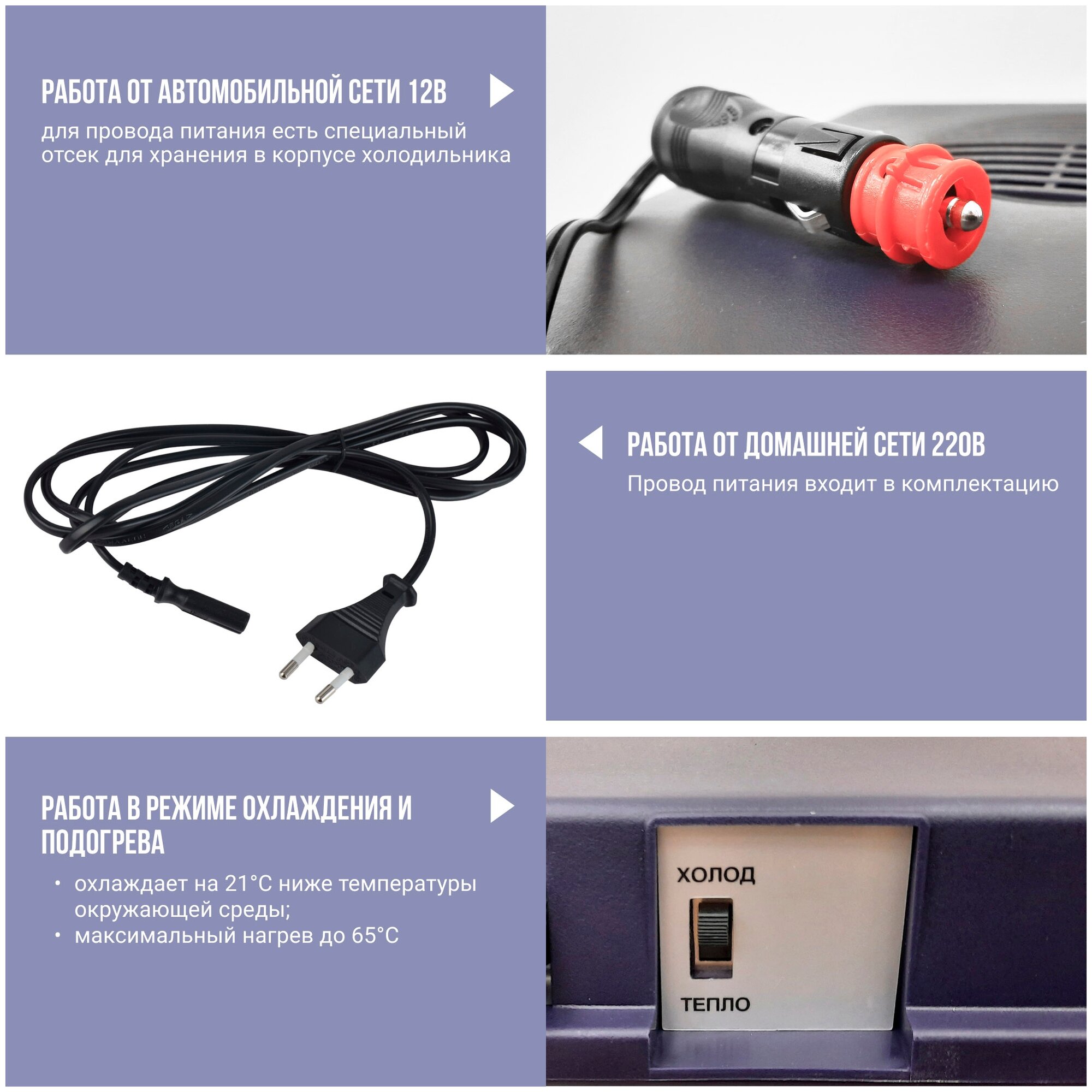 С помощью прочной и удобной ручки легко донести холодильник до своей машины. В сложенном виде ручка является стопором от нежелательного открытия. Для автомобильного шнура питания есть специальный отсек для хранения, а для домашнего использования (220-240В) есть свой провод питания.