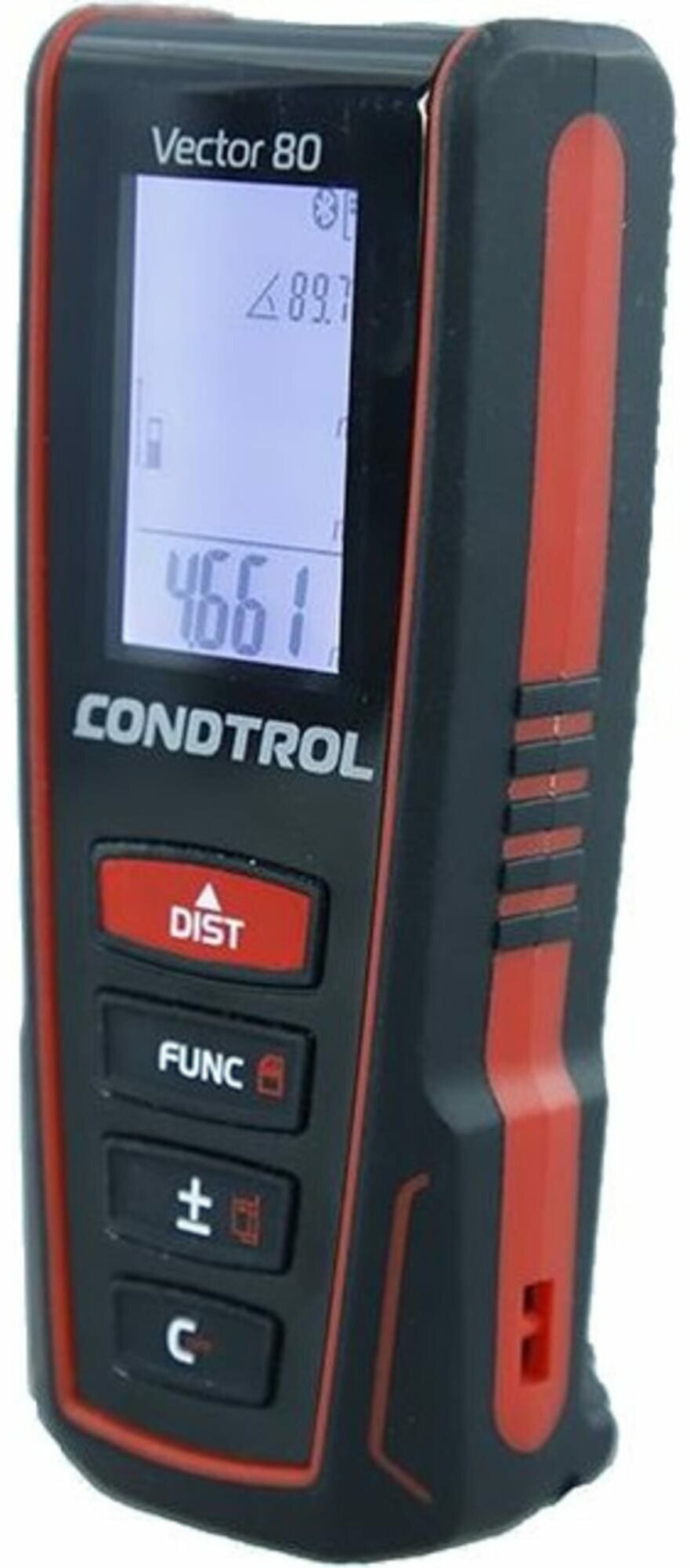 | Прочие особенности | Функция Point-to-Point. Лазерная рулетка CONDTROL Vector 80 может измерять расстояние между двумя произвольными точками в пространстве, благодаря встроенному 3D- акселерометру. Таким образом, вы сможете всего по двум замерам определить длину отрезка, проходящего сквозь здания или препятствия (стена, деревья, забор).,Передача данных по Bluetooth. Встроенный модуль Bluetooth позволяет работать с приложением CONDTROL Smart Measure, которое можно загрузить из Google Play или App Store. С приложением CONDTROL Smart Measure вы сможете:,– хранить в памяти смартфона неограниченное число измерений;,– фотографировать объекты, помещения, декор, мебель и наносить размеры на них, делать ремарки, комментарии, что по достоинству оценят архитекторы, дизайнеры, декораторы;,– рисовать планы помещений с размерной сеткой;,– сохранять и экспортировать полученные файлы, что значительно упрощает работу строителей, дизайнеров, изготовителей мебели и т.д.,Площадь стен (функция маляра). Рассчитать расход материалов для ремонта (обои, шпаклевка) с дальномером CONDTROL Vector 80 не составит труда. С функцией маляра вы быстро определите площадь стен помещения, достаточно один раз измерить высоту потолков и длину всех стен. Дальномер сам складывает полученные площади и показывает их нарастающим итогом.,Горизонтальное и вертикальное проложение по одному замеру. Встроенный датчик наклона позволяет вычислить горизонтальное и вертикальное проложение от места установки дальномера до объекта, например, когда нужно определить высоту здания и расстояние до него при наличии преграды (заграждение, дерево, ров).,Пылевлагозащита IP 54. Благодаря герметичному корпусу, лазерная рулетка надежно защищена от брызг воды и пыли. Большие силиконовые кнопки не потрескаются на морозе, их удобно нажимать даже в перчатках. Это позволяет использовать CONDTROL Vector 80 в условиях стройплощадки.,Крепление на штатив и откидная пятка. Для комфортной работы замер расстояния может производиться с передней, задней кромки корпуса, со штатива или с откидной пятки. Откидная пятка дает возможность производить замеры с узких мест, углов или с края поверхности (стол, подоконник).,Встроенный Li-ion аккумулятор. Отсутствие батарейного отсека повышает жесткость корпуса и степень пылевлагозащиты. Ресурс аккумулятора приятно удивит пользователя. Одного часа зарядки хватит на несколько сотен измерений. Зарядить дальномер можно через кабель microUSB. |
