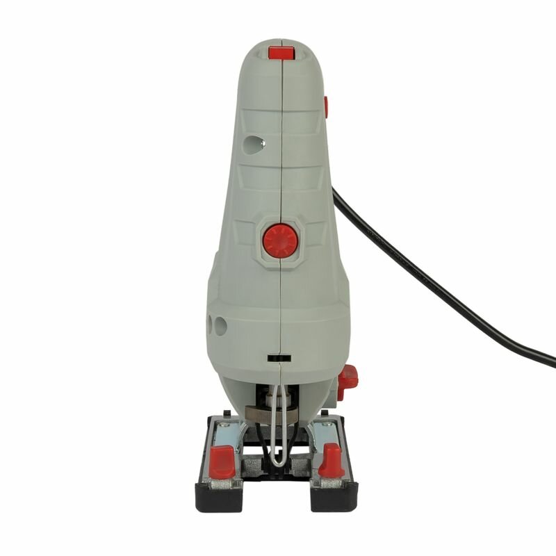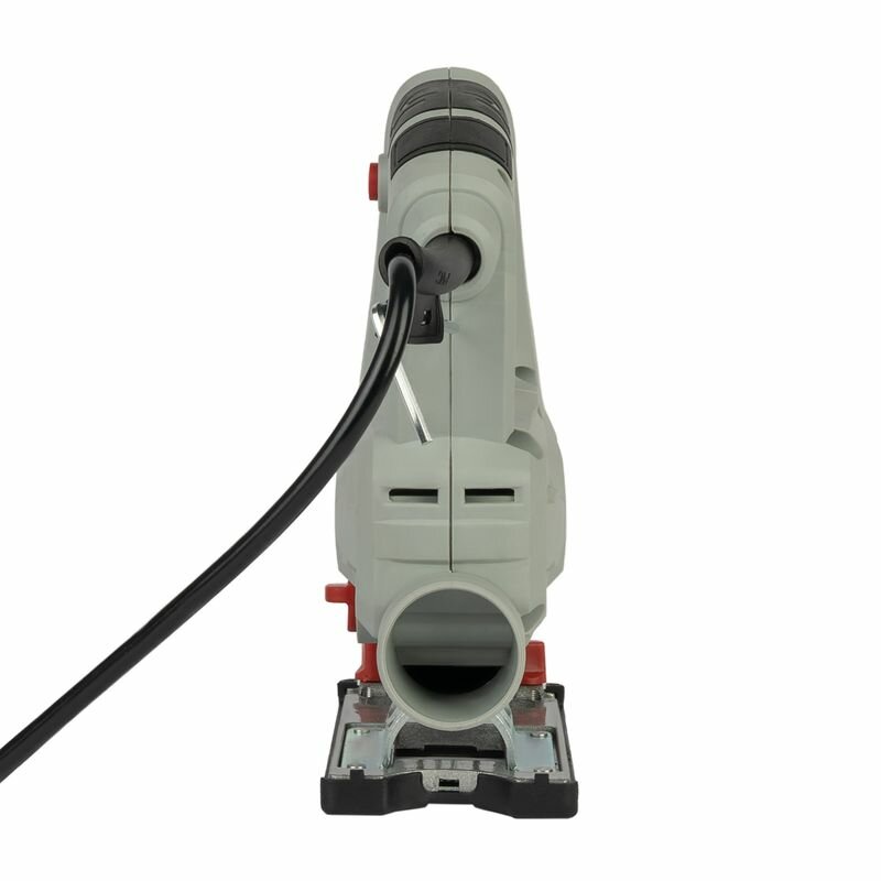 Предпочел купить более серьезную модель, которая стоит на тыс. руб. дороже базовой. Зато здесь побольше мощи, есть регулировка хода, подсветка с лазерным указателем. Само собой есть раструб для подключения пылесоса. А еще у данной модели очень прочная, жесткая и устойчивая станина, которая отлично гасит ненужные вибрации, и благодаря которой лобзик не сходит с заданного направления. Выглядит значительно качественней других брендов в этой цене
