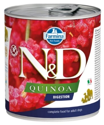 Farmina N&D Dog Quinoa Digestion - диетический полнорационный влажный корм для собак, рекомендуемый при нарушениях переваривания пищи и при экзокринной недостаточности поджелудочной железы.