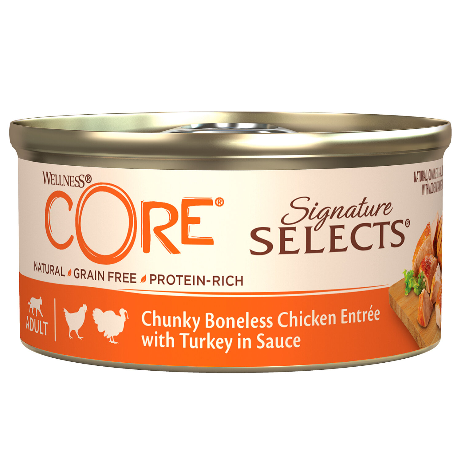 CORE SIGNATURE SELECTS консервы из курицы с индейкой в виде кусочков в соусе для кошек. Беззерновые консервы Wellness CORE созданы, чтобы радовать вашего питомца оригинальным вкусом и нежной текстурой.Высококачественный белок животного происхождения. Правильные углеводы, овощи и пребиотики в Wellness CORE обеспечивает сбалансированное натуральное беззерновое питание для кошек.Преимущества влажных рационов Wellness CORE:- Оптимальный баланс белков, жиров и углеводов.- До 58% свежих мясных ингредиентов. Сочетание нескольких источников белка.- Большое количество витаминов, минералов и антиоксидантов для поддержания иммунитета.- Легкоусвояемая формула с клетчаткой для здоровой микрофлоры.- Беззерновое питание. Не содержит пшеницу, кукурузу и сою. Подходит для животных с чувствительным пищеварением.- Жирные кислоты Омега-З и Омега-6 в оптимальном соотношении для здоровья кожи и шерсти.Рекомендации по кормлению: При кормлении только влажным кормом Wellness CORE: примерно 3 банки на 4 кг веса животного ежедневно. В сочетании с сухим кормом Wellness: 14 г сухого корма должно приходиться на каждую банку влажного корма.Рекомендуется подавать корм комнатной температуры.Вскрытую банку хранить в холодильнике не более суток.Всегда обеспечивать питомцу свободный доступ к чистой питьевой воде.Ингредиенты: Куриный бульон, курица, индейка, картофельный крахмал, яйца, подсолнечное масло, минералы.Состав: Куриный бульон, курица 28%, индейка 4%, картофельный крахмал, яйца, подсолнечное масло, минералы.Пищевая ценность: белки 7,6%, жиры 5,0%, сырая клетчатка 0,3%, сырая зола 2,1%, влага 76%.Добавки на кг: таурин 1 540 мг, витамин А 15 400 МЕ, витамин D3 454 МЕ, витамин Е 69 мг, aминокислотный хелат цинка гидрат 115 мг, aминокислотный хелат железа гидрат 79 мг, aминокислотный хелат марганца гидрат 28 мг, aминокислотный хелат меди гидрат 18 мг, йодид калия 0,3 мг, селенит натрия 0,065 мг, натрий 0,1%, кальций 0,23%, магний 0,02%, фосфор 0,17%.