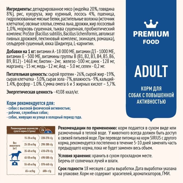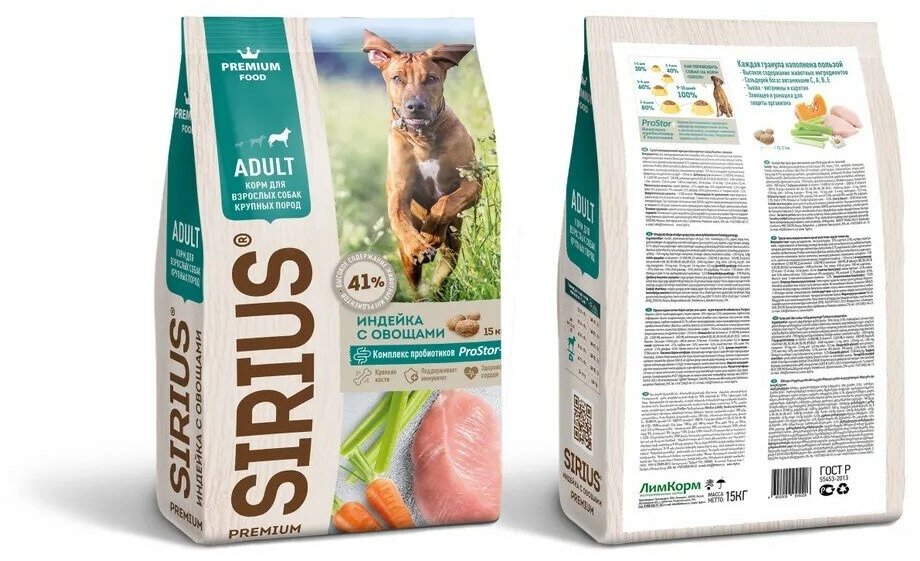 Sirius крупных пород. Сухой корм Сириус с мясом птицы предназначен для взрослых собак крупных пород. По ингредиентному составу относится к кормам премиум класса. Содержит все витамины и минеральные вещества необходимые для повседневного здорового питания вашего питомца.