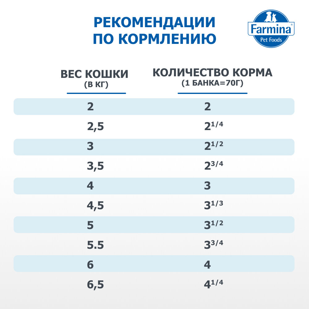 Рекомендации по применению. Суточное количество корма указано в таблице на упаковке. Дневная норма может меняться в зависимости от индивидуальных особенностей и требует корректировки для поддержания кошки в оптимальной кондиции. При переводе на N&D рекомендуется постепенно замещать предыдущий корм на новый. Суточное количество корма может быть разделено на два и более кормления. Перед кормлением корм должен быть комнатной температуры. Кошка должна иметь свободный доступ к свежей питьевой воде. Открытую банку хранить в холодильнике не более 48 часов.