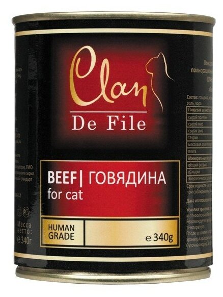 Clan quot; De File quot; - полнорационный влажный корм для каждодневного питания кошек. У корма насыщенный вкус и сбалансированный состав. Консервы изготовлены из высококачественного мясного сырья. Для производства корма используется щадящая технология, бережно сохраняющая максимум питательных веществ и витаминов, отборное сырье и специально разработанная рецептура, которая обеспечивает продукции изысканный деликатесный вкус и ярко выраженный аромат. Товар сертифицирован. Чем кормить пожилых кошек: советы ветеринара. Влажныеu0026nbsp; кормаu0026nbsp; для кошек суперпремиум-класса «Говядина». u003cbr/u003eu003cbr/u003eСостав: говядина, желирующая добавка, таурин, u0026nbsp; соль, вода. u003cbr/u003eu003cbr/u003eПищевая ценность100 г. продукта: сырой протеин, не менее - 12,0 г; сырой жир , не более - 10,0 г; сырая зола, не более - 2,0 г; таурин - 0,3 г; массовая доля поваренной соли - 0,4-0,6 г; u0026nbsp; влага - не более 82 . u003cbr/u003eu003cbr/u003eМинеральные вещества в 100 г. продукта: общий фосфор - не более 0,4 г; кальций, не более - 0,3 г; u003cbr/u003eu003cbr/u003eЭнергетическая ценность в 100 г. продукта - 138,0 ккал. u003cbr/u003eu003cbr/u003eСрок годности: u0026nbsp; не более 3 лет со дня изготовления. u003cbr/u003eu003cbr/u003eДата изготовления указана на крышке банки. u003cbr/u003eu003cbr/u003eУсловия хранения: при температуре от 0 до 25 С и относительной влажности воздуха - не более 75 . u003cbr/u003eu003cbr/u003eРекомендуется употреблять при комнатной температуре. u003cbr/u003eu003cbr/u003eПосле вскрытия потребительской упаковки продукт хранить в холодильнике не более 2 суток. u003cbr/u003eu003cbr/u003eСуточная норма 30-50 г. на 1 кг. веса животного.