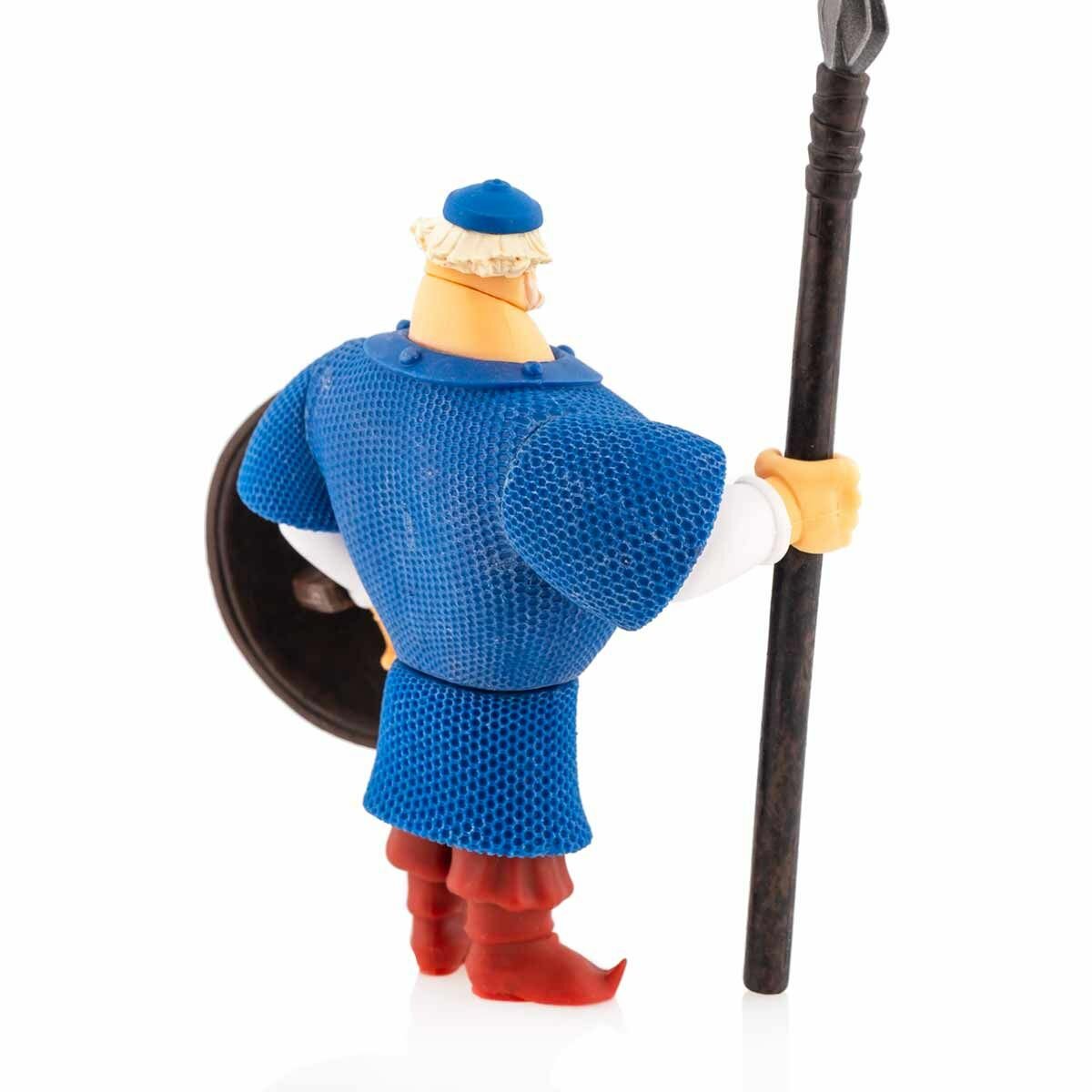 Добрыня Никитич одет в синюю кольчугу, красные штаны и сапоги. В одной руке держит копье, в другой круглый щит с имитацией металла. Высота фигурки 8,5 см.