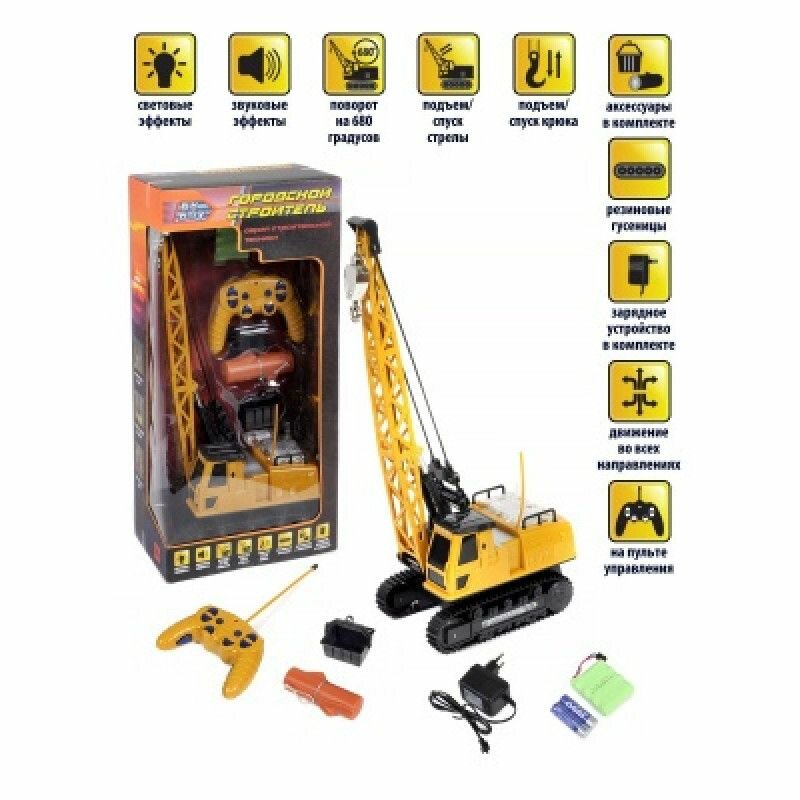 Поворот башни на 680 градусов, подъем/спуск стрелы и крюка, резиновые гусеницы, движение во всех направлениях, звуковые и световые эффекты, в коробке 26,5*16*52,5 см.