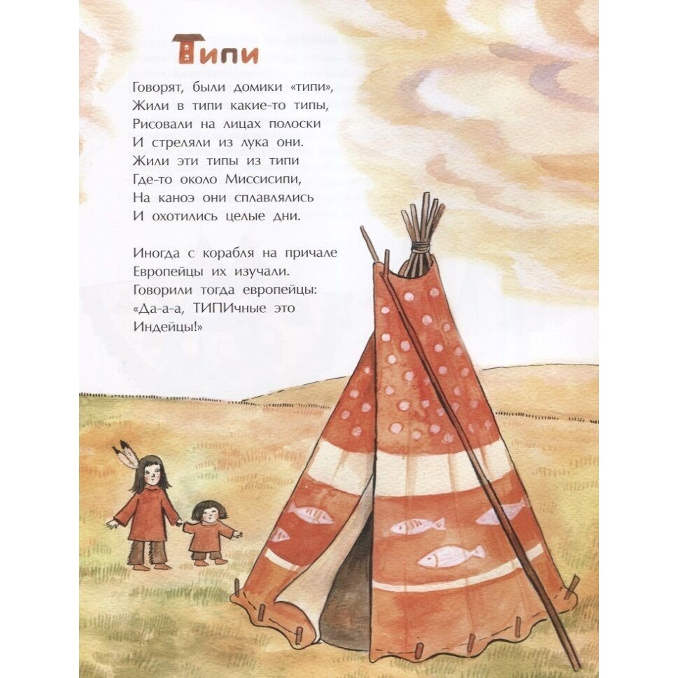 «Вам знаком этот дом?» Я думаю, что все помнят эпизод из мультфильма про Простоквашино, в котором Шарик рисует «национальную индейскую народную избу», которая называется «фигвам». Так вот, из этой книги вы узнаете, что, оказывается, нарисовал Шарик типи! А вигвам выглядит совершенно по-другому! Кроме этой, прямо скажем, душещипательной подробности, вы узнаете интересные факты о небоскребах, шале, яранге и многом другом. И, конечно же, есть здесь обожаемое нами стихотворение Наталии Волковой про бунгало. В общем это весело, интересно и расширяет кругозор. Очень рекомендую!