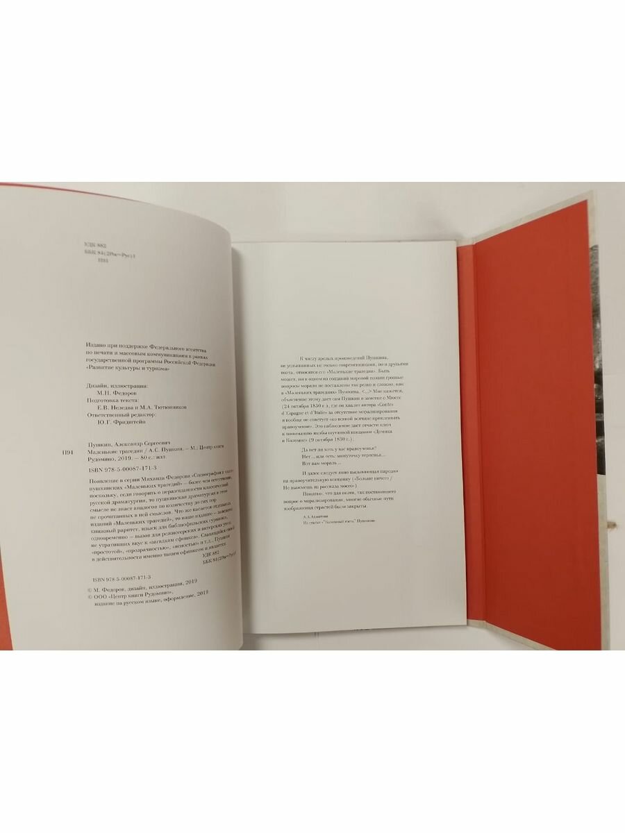 Ну вот захотелось мне срочно перечитать "Маленькие трагедии", а фамильного 10-томного академического издания Александра Сергеевича под рукой нет - стоит в другом городе в другой стране. И надо мне, чтоб не библиотечная, а своя книга была. Пошла в магазин, там только школьные издания, неполные. Зашла на сайт, среди прочих вариантов увидела этот. Дорого. Но решила, уж если брать для домашней библиотеки, то красивое, качественное издание. Да, книга для библиофилов, для коллекций, а не для работы. Но издатели сразу это и указывают. Полиграфическое исполнение отличное, книгу приятно взять в руки. Пользоваться нужно осторожно, архитектоника сложная и хрупкая. Понравился мне ещё второй издательский посыл, о том, что "пушкинская драматургия... не знает аналогов по количеству до сих пор не прочитанных в ней смыслов". И две удачно подобранных цитаты из А. Ахматовой и Ю. Лотмана предваряют пушкинский текст. В конце представлены другие семь книг серии " Сценография в книге" - очень элегантно. Единственным недостатком покупки считаю дороговизну, но снимать звезду за это рука не поднимается, над книгой работала команда профессионалов.
