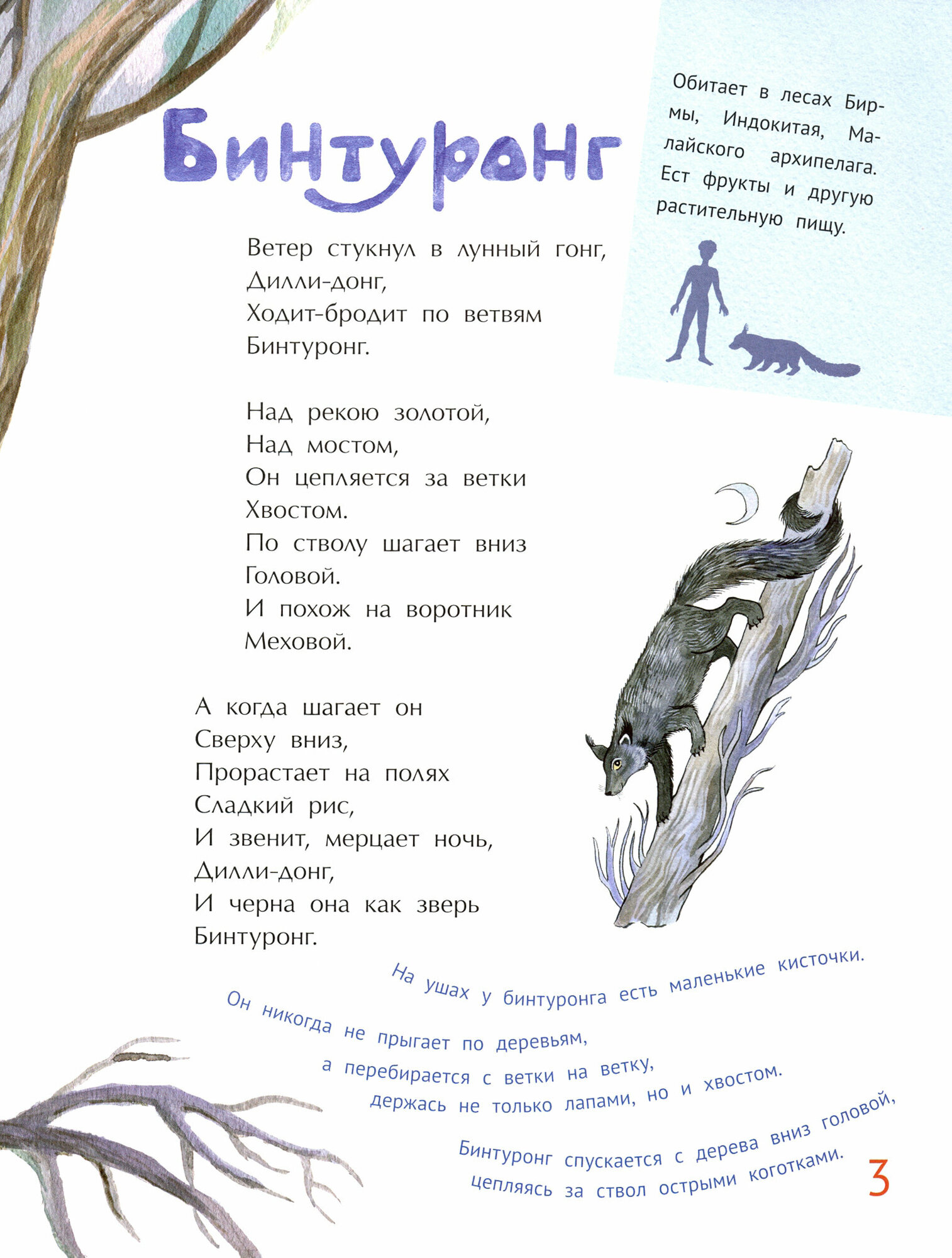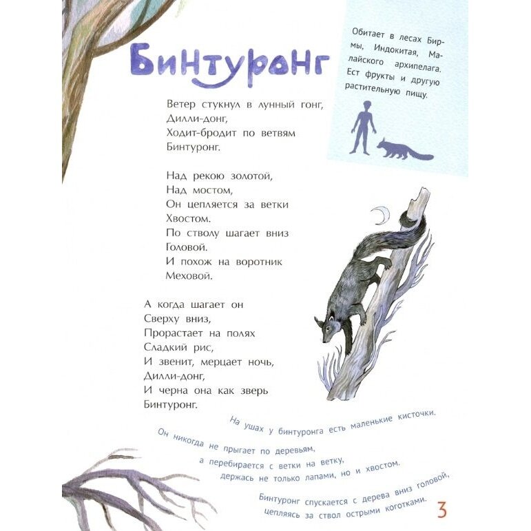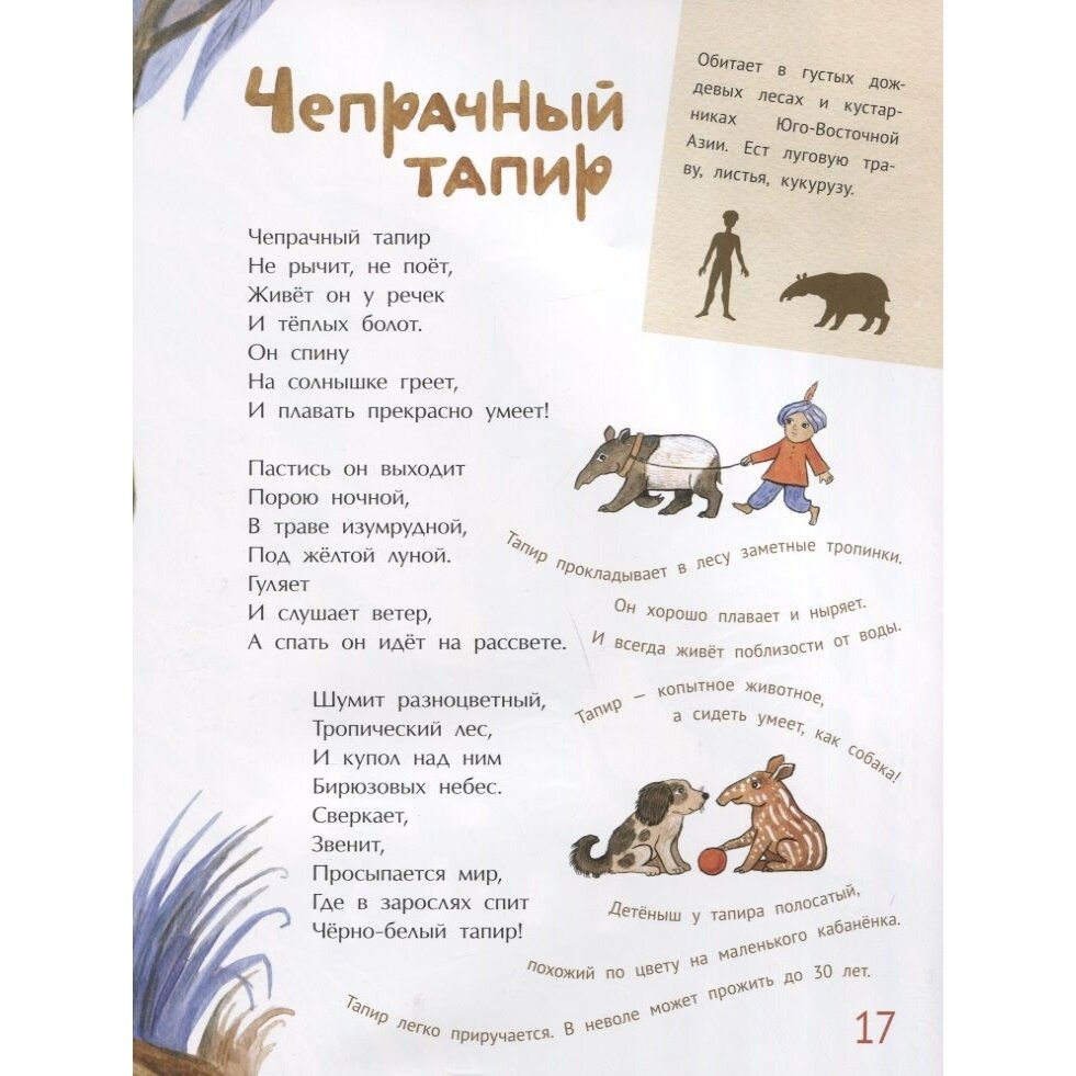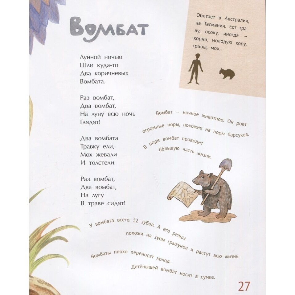Про каждого животного сочинено стихотворение и даны некоторые факты, включая ореол обитания и питание.