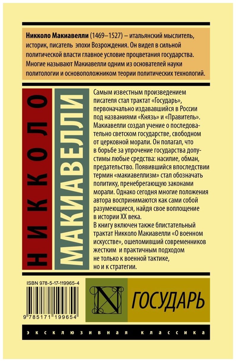 Самым известным произведением писателя стал трактат "Государь", первоначально издававшийся в России под названиями "Князь" и "Правитель". Макиавелли создал учение о последовательно светском государстве, свободном от церковной морали. Он полагал, что в борьбе за упрочение государства допустимы любые средства: насилие, обман, предательство. Появившийся впоследствии термин "макиавеллизм" стал обозначать политику, пренебрегающую законами морали. Однако сегодня многие положения автора воспринимаются как сами собой разумеющиеся, найдя свое воплощение в истории XX века.