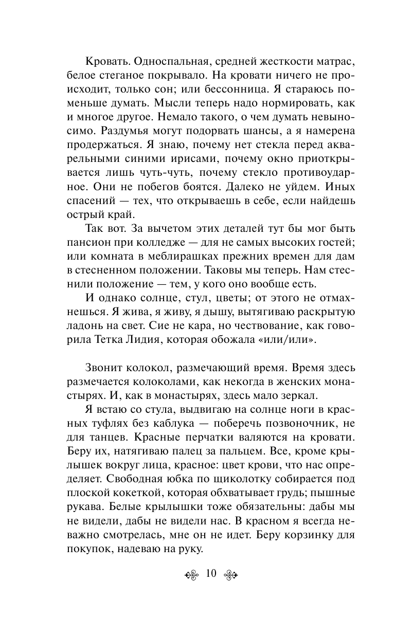 Прекрасное издание в стиле минимализма. Мне очень понравилась серия. Ничего лишнего приятно держать в руках. Книга написана языком потока сознания от лица главной героини, которая оказывается в мире где женщины не имеют ни каких прав, а всю власт захватили военные ещё и религиозные фанатики или они просто этим прикрываются. Сложно назвать книгу антиутопией нам полностью не раскрыт мир, мы видим его лишь через глаза и мир главной героини которая лишилась всего в том числе и своего имени от лагеря ее спасает лишь наличие фертильной функции. Книга заставляет о многом задуматься.