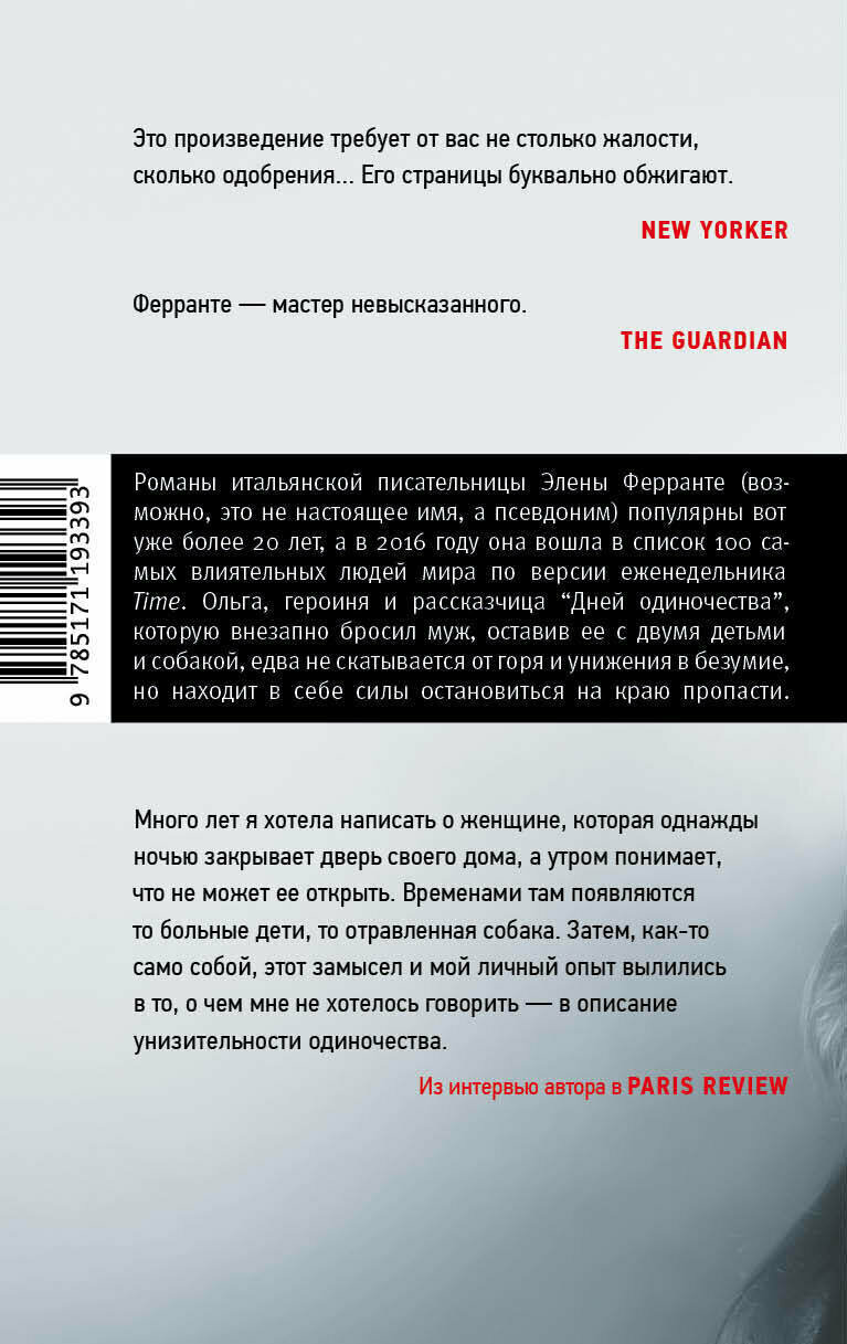 "Дни одиночества" - это тонкая и психологически выверенная проза, итальянский роман о женщине, которую бросил муж, оставив ее с двумя детьми и собакой. Ольга, главная героиня, она же и рассказчица, проходит через тяжелейшее испытание, едва не скатывается от горя и унижения в безумие, но удерживается на краю пропасти и продолжает жить - и любить. Создавший образ этой женщины автор, Элена Ферранте, - личность загадочная, предпочитающая оставаться в тени своих книг. Неизвестно даже, пользуется ли она псевдонимом или пишет под собственным именем. Ее романы переведены на 40 языков, и в 2016 году она вошла в список 100 самых влиятельных людей мира по версии еженедельника Time.