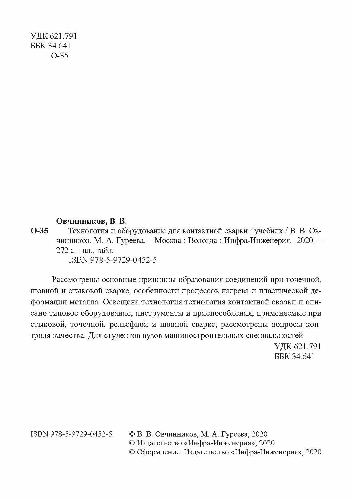 Технология и оборудование для контактной сварки. Учебник (Овчинников Виктор Васильевич, Гуреева Марина Алексеевна); Инфра-Инженерия, 2020