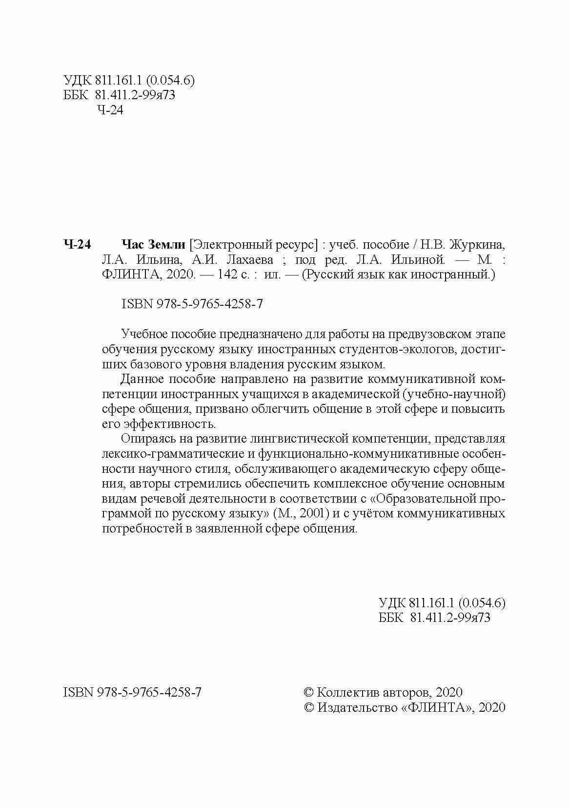 Учебное пособие предназначено для работы на предвузовском этапе обучения русскому языку иностранных студентов-экологов, достигших базового уровня владения русским языком. Данное пособие направлено на развитие коммуникативной компетенции иностранных учащихся в академической (учебно-научной) сфере общения, призвано облегчить общение в этой сфере и повысить его эффективность.