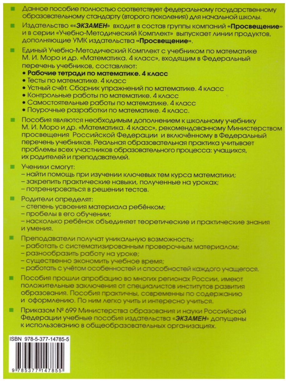 .Рабочая тетрадь по математике предназначена для самостоятельной работы учащихся. Задания в тетрадях соответствуют учебнику М. И. Моро и др. "Математика. 4 класс".
