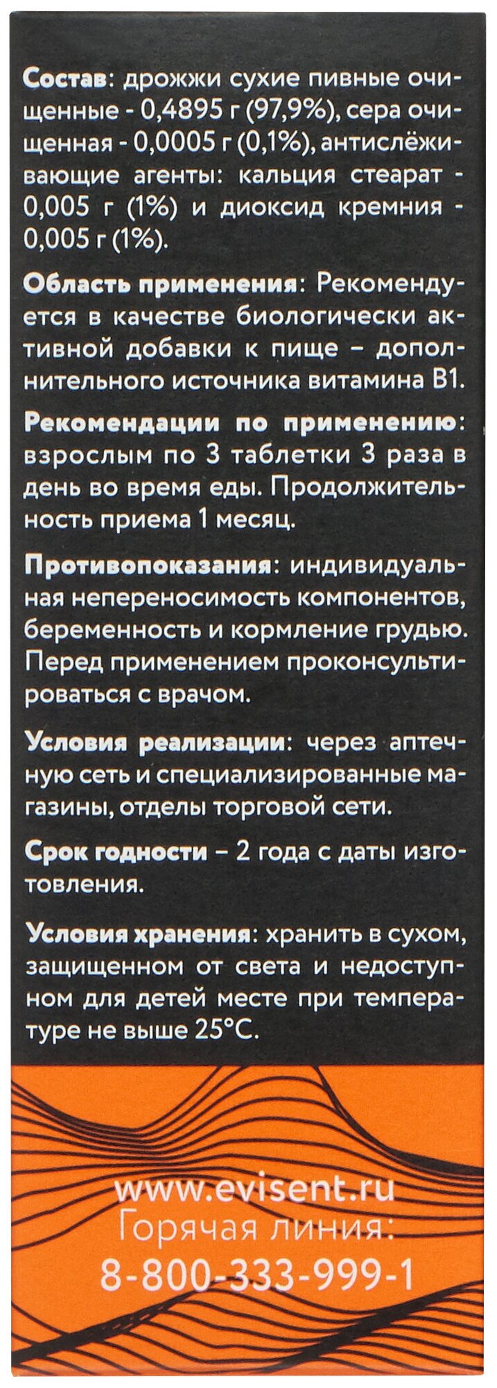 | Состав | дрожжи сухие пивные очищенные - 0,4895 г (97,9%), кальция стеарат - 0,005 г (1%), аэросил - 0,005 г (1%), сера очищенная - 0,0005 г (0,1%) |