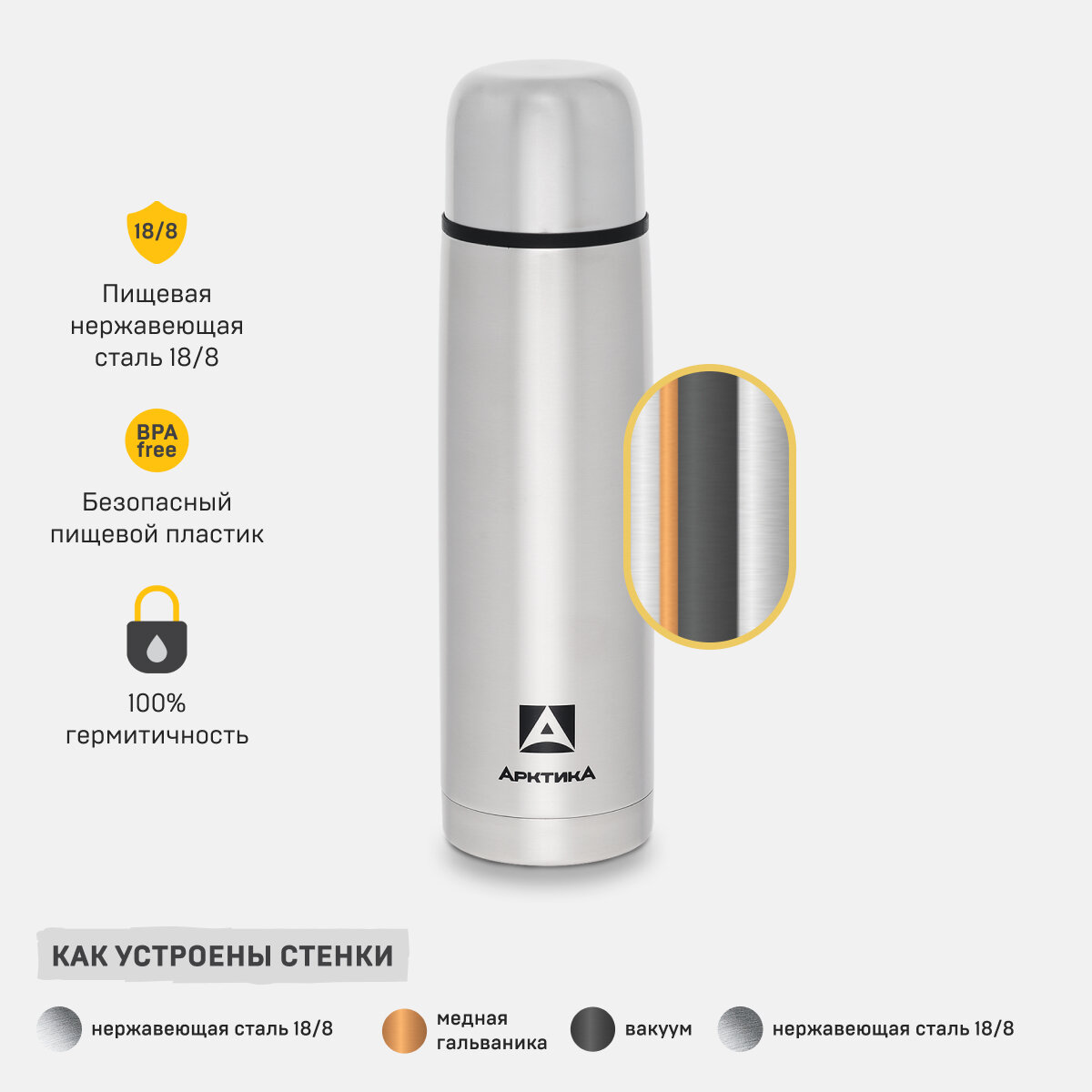 Корпус Арктика выполнен из нержавеющей стали и прослужит вам долгие годы. Металлическая колба также продлит срок службы термоса.