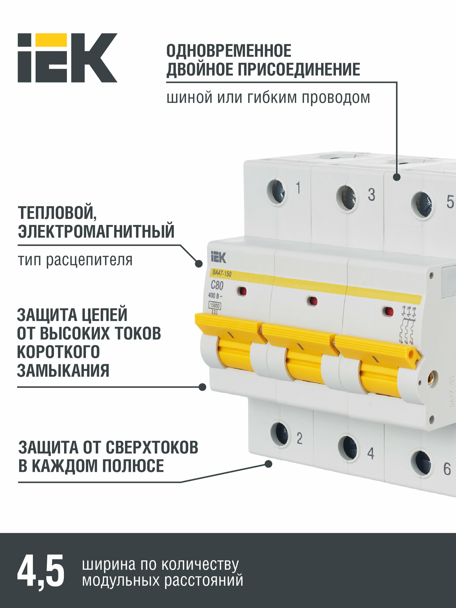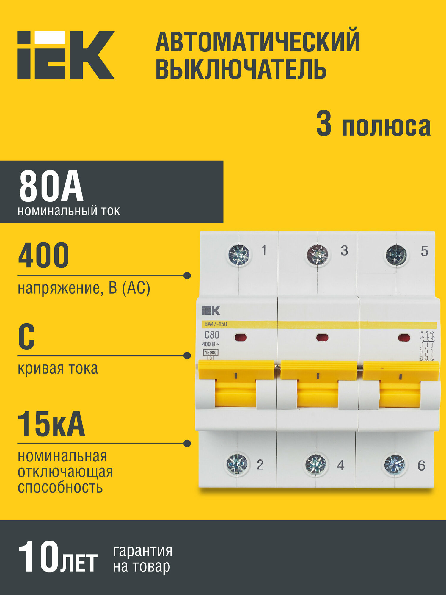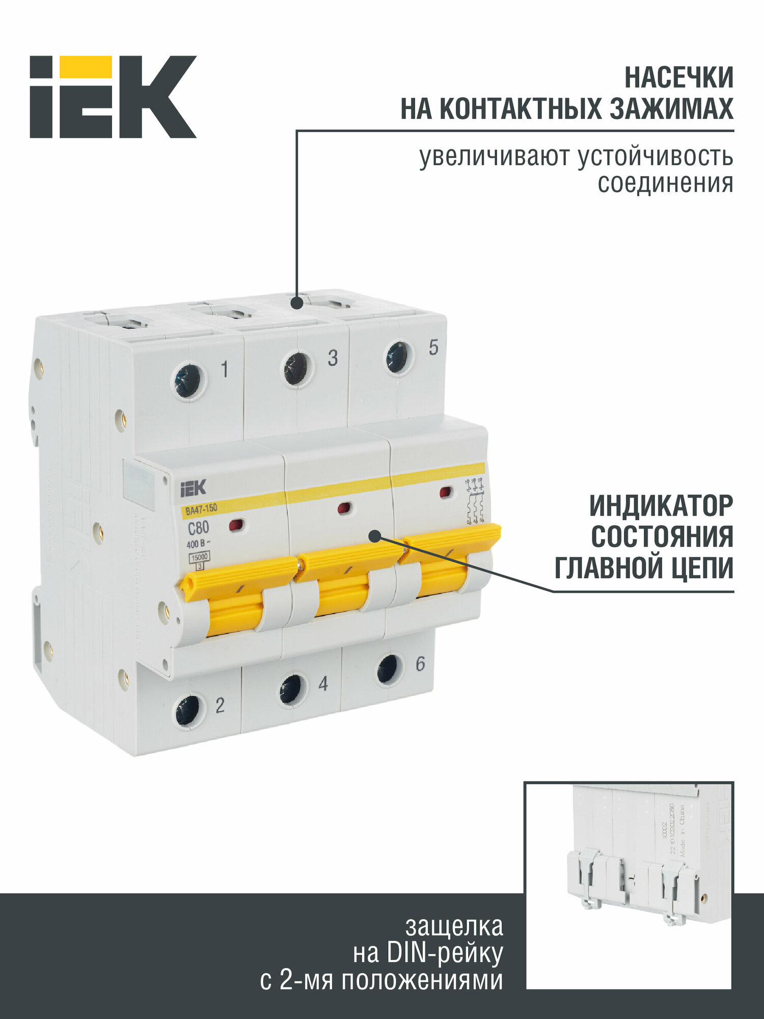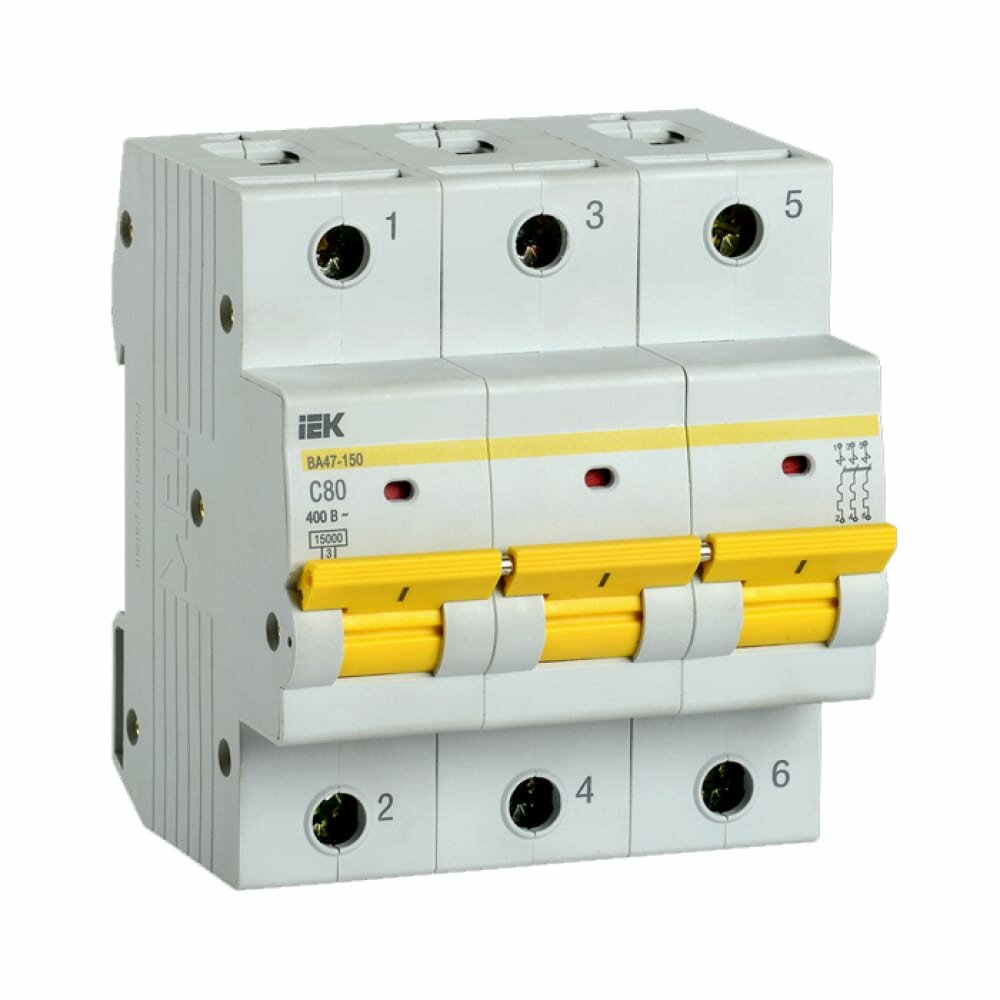 ВА47-150 MVA50-3-080-C Автоматический выключатель трехполюсный 80А (15 кА C) Упаковка (4 шт.) IEK