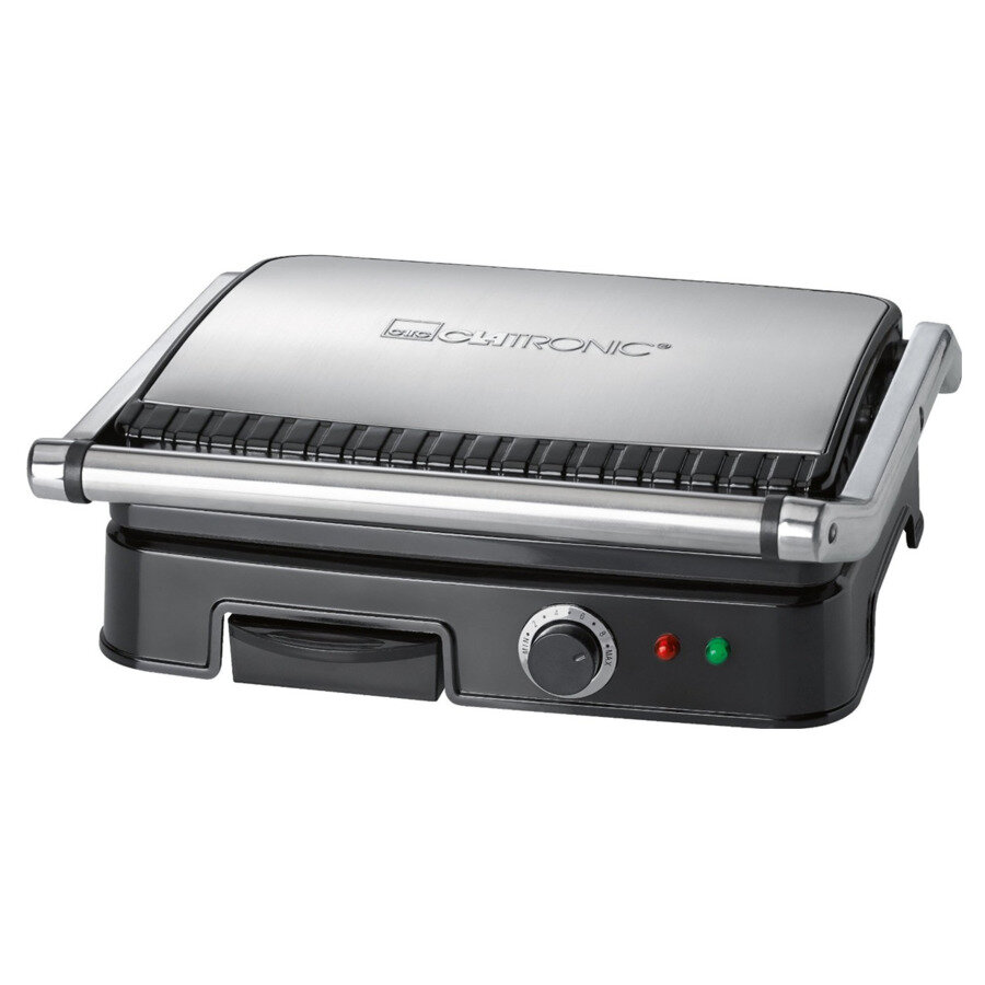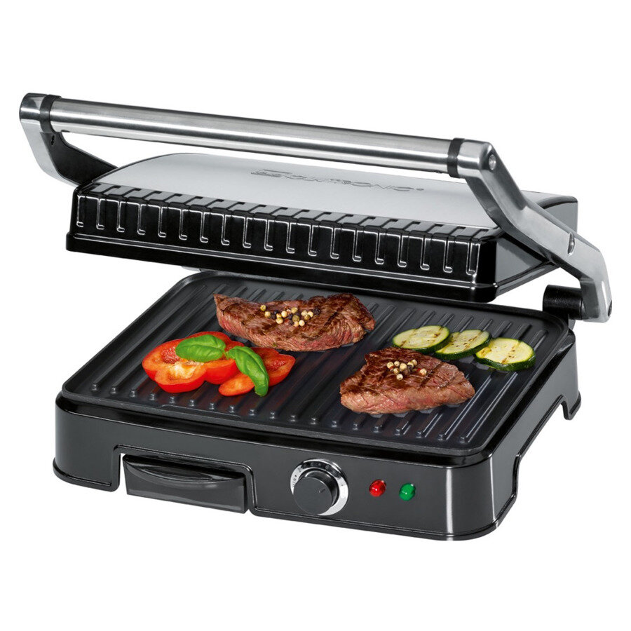 Clatronic – электрический гриль, при крайне демократической цене сочетающий в себе возможности двухстороннего гриль-пресса и барбекю, оснащенный поддоном для стока лишнего жира и функцией плавной регулировки температуры.