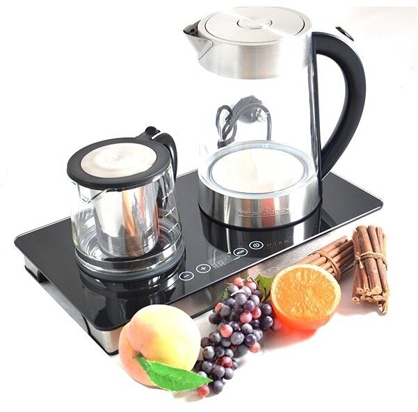 Набор Profi Cook рассчитан на настоящих ценителей чайного дела. Стильный и современный дизайн сделает его центром вашего интерьера. Комплект включает в себя сенсорную панель-подставку, электрочайник и заварочный чайник. Выполнены все компоненты в черном цвете с большим включением термостойкого стекла. Объем основного чайника составляет 1.7 литра. Нагревательный элемент расположен в хромированном дне. Благодаря тому, что нагрев осуществляется без провода, емкость можно вращать на 360 градусов. Нагрев полного количества воды происходит всего за пару минут. Заварочный чайник может вместить 1200 мл. Сделан набор Profi Cook из крепкого и надежного стекла. Внутри располагается фильтр, предназначенный для заварки чая или кофе. Он сделан из качественной нержавеющей стали, которая устойчива к коррозии даже при высоких температурах. Панель-подставка имеет сенсорное управление и несколько режимов работы. Для кофе, автоматическая температура выставляется на уровне 85 градусов Цельсия, а вот уже для чая - 80. Также есть возможность установки температуры в ручном режиме. При этом, дискретность шага настройки, равна один градус. Материал поверхности – крепкое керамостекло с глянцевой полировкой. Управление в Profi Cook - сенсорное.