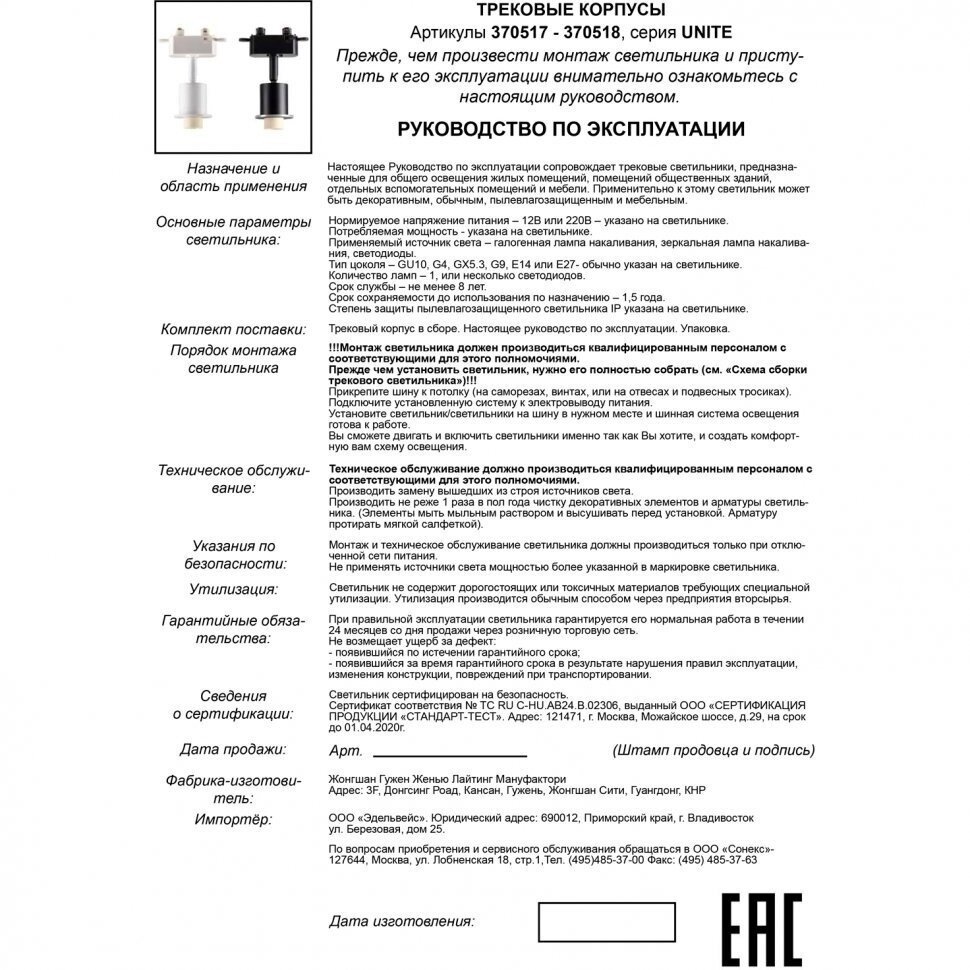 | способ крепления | Шинопровод (трек) |