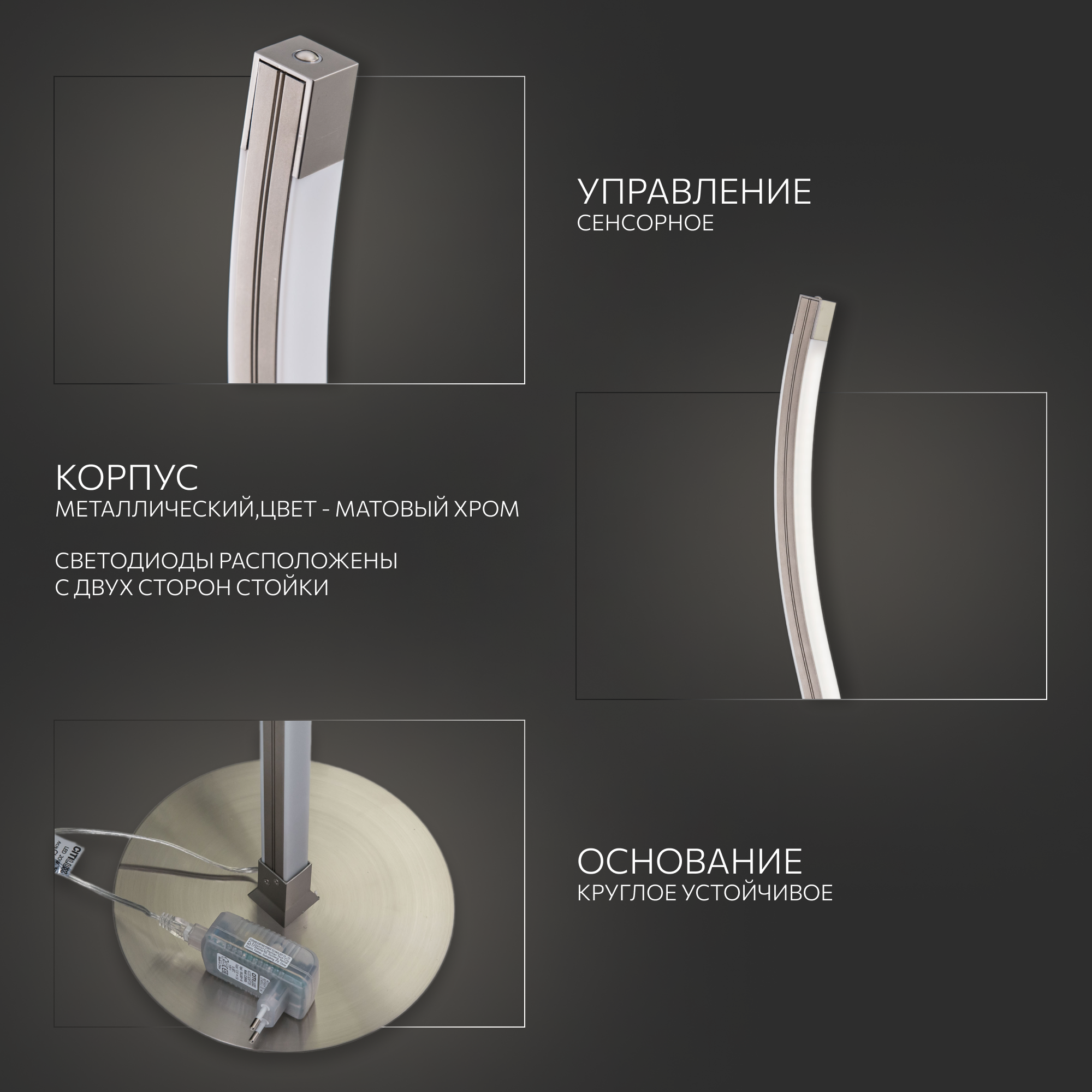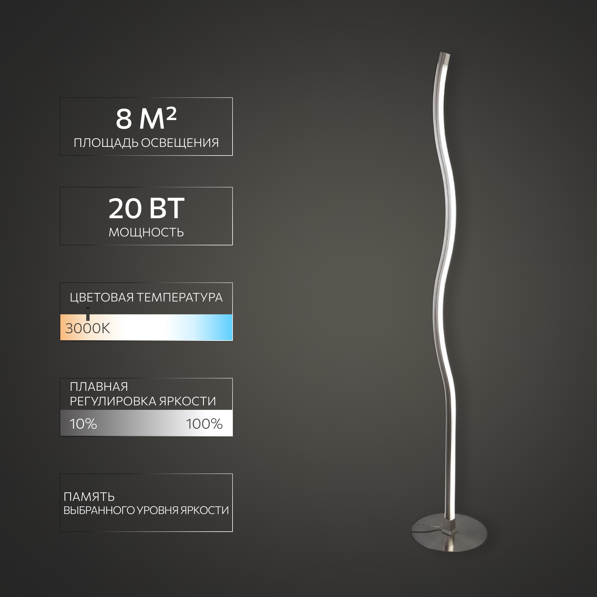 | Дополнительные характеристики | торшер имеет функцию плавной регулировки яркости при помощи встроенного диммера |