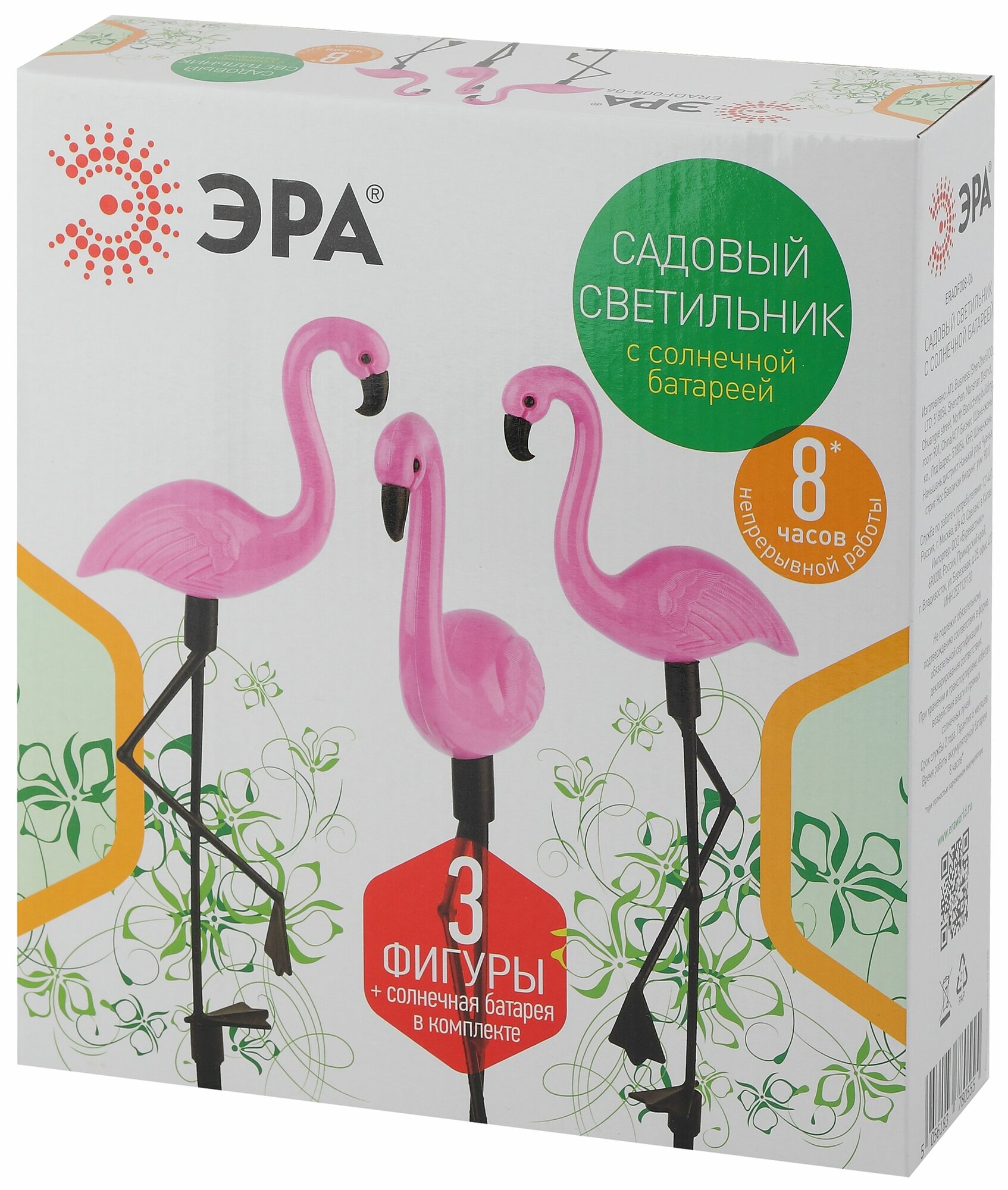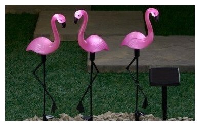 Светильник садовый 52.5см солнечная батарея пластик 3шт ЭРА Б0038501Беспроводной led светильник Фламинго станет чудесным украшением вашего сада. Удобная конструкция и упрощенная сборка позволят Вам разместить подсветку около клумбы, украсить пруд, территорию рядом с бассейном, необычно подсветить тропинку или вход в террасу. 3 пластиковые фигурки высотой 52,5 см крепятся на штекер и с легкостью втыкаются в землю. Светильник функционирует на солнечной батарее. Такой способ получения энергии является максимально экологичным, энергоемким, а также бесшумным. Питание происходит во включенном режиме, днем. С наступлением ночи фламинго загораются. Животики и головки фигурок заливаются спокойным белым светом и освещают территорию вокруг себя, создавая уютную атмосферу. Подсветка Вашего сада может длиться непрерывно в течение 8 часов. Высокая степень защиты от пыли и влаги позволяет оставлять светильник на улице даже во время дождя. Обращаем Ваше внимание, что перед использованием фигурки её необходимо включить и зарядить. Светильник заряжается в течение всего светового дня. Декоративный светильник от компании ЭРА чудесный вариант для преображения Вашего сада.