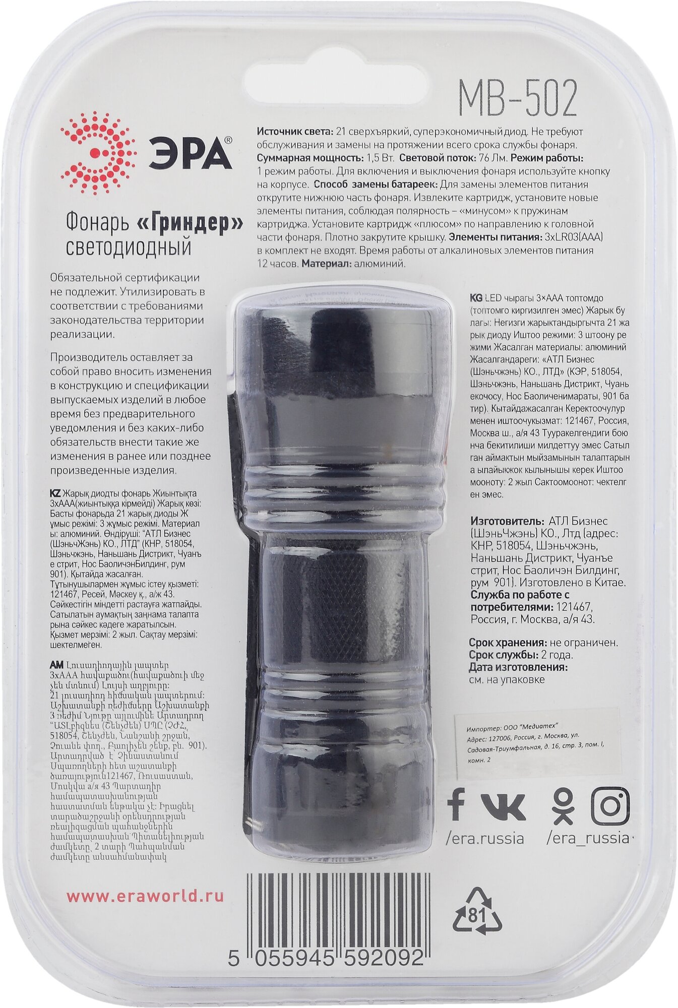 Фонарь светодиодный алюминий ЭРА (MB-502)