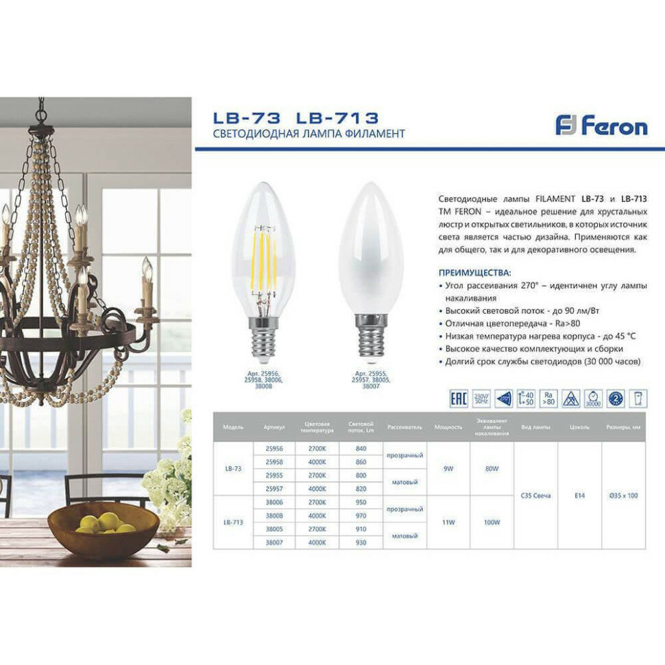 Лампа светодиодная филаментная Feron E14 11W 2700K Свеча Прозрачная LB-713 (38006)