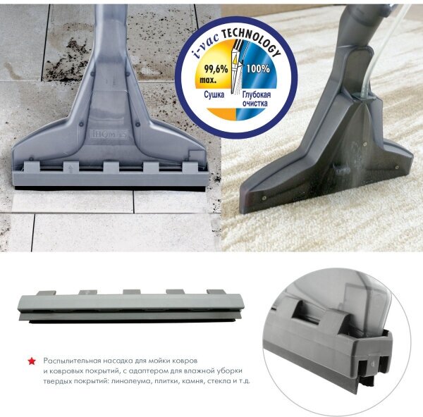 | Комплектация | пылесос, насадки:пол/ковер, моющая насадка для ковров с адаптером для гладких поверхностей, щелевая, для мягкой мебели |