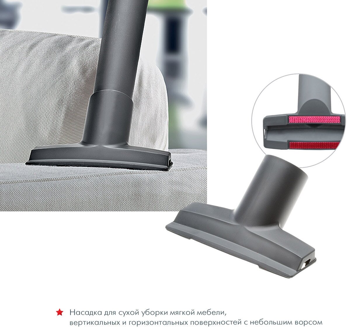| Насадки | для уборки ковров; для сухой уборки мягкой мебели; щелевая; для влажной уборки ковров с адаптером для твердых покрытий; для влажной уборки мягкой мебели |